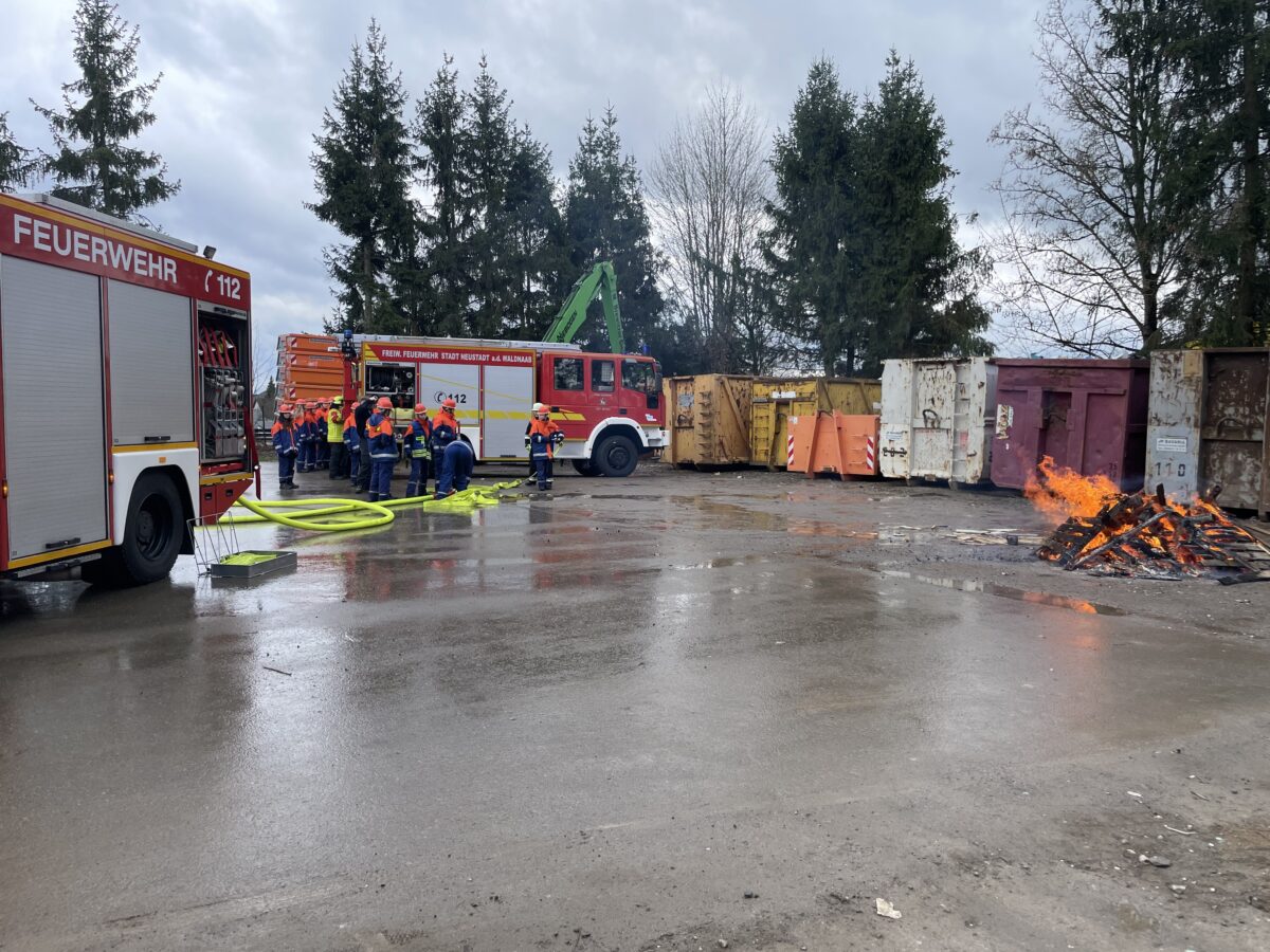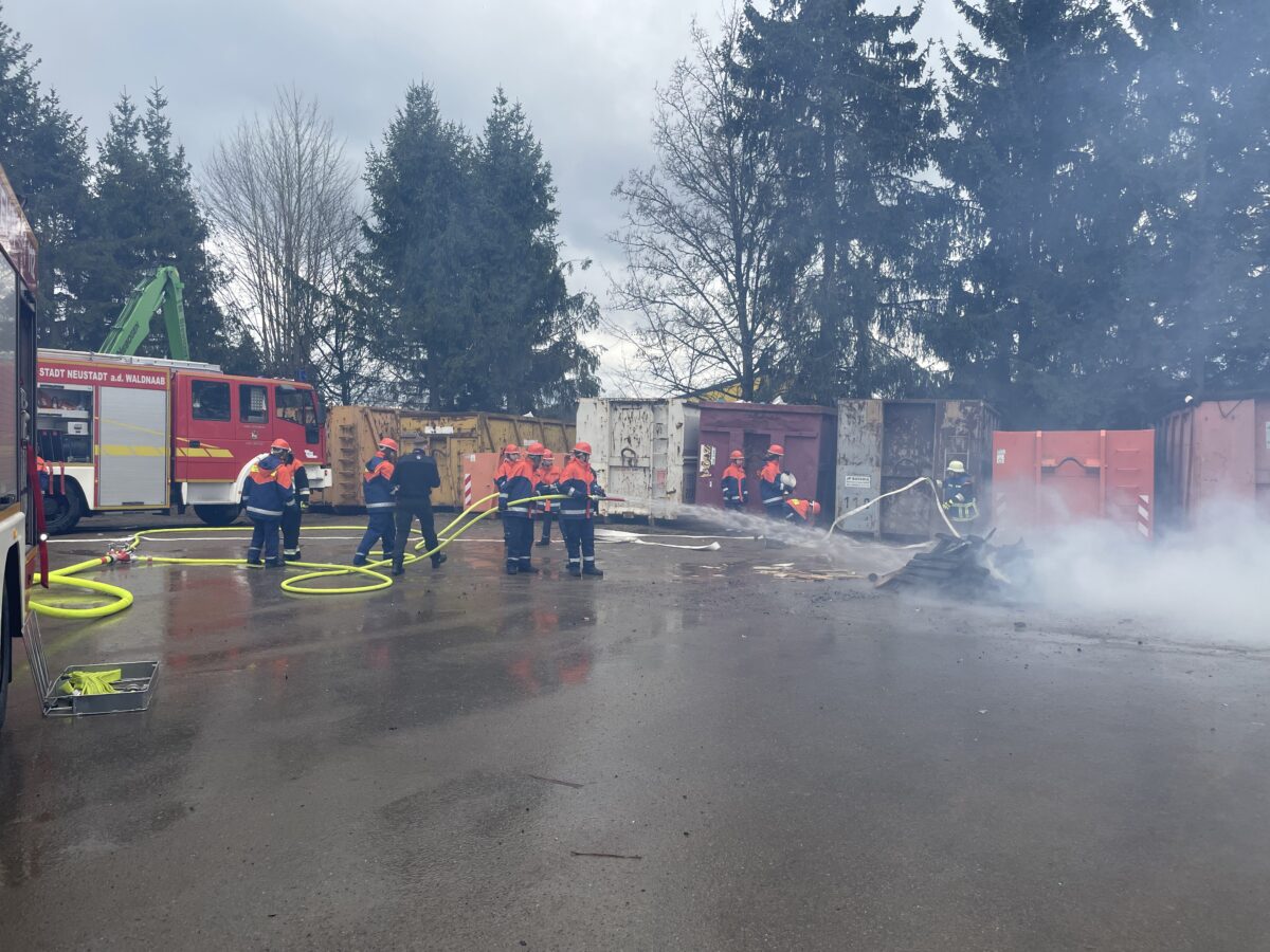 Von Freitag auf Samstag übernachteten die Jugendlichen im Feuerwehrhaus in Neustadt. Neben Teambuilding-Maßnahmen, Übungseinheiten, Gerätekunde, gemeinsamem Essen und Freizeit warteten verschiedenen Einsatzübungen: das Beseitigen einer Ölspur, die Rettung einer Katze vom Baum in 15 Meter Höhe mittels Drehleiter, die Rettung von drei Personen, die auf unwegsamem Gelände beim Spazierengehen verunglückt waren sowie ein Brandeinsatz auf dem Gelände der Firma M. Brewitzer GmbH in Neustadt/WN.