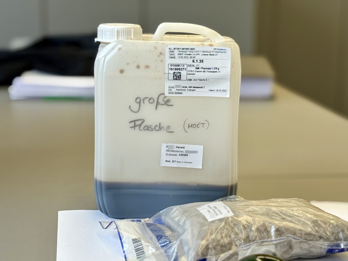 Die sieben in Deutschland eingesammelten Flaschen landeten zur Untersuchung im Landeskriminalamt. Der forensische Chemiker Dr. Jan Schäper erklärt die Ergebnisse. Jede Drei-Liter-Flasche enthielt knapp 1.000 Gramm MDMA-Base, dazu am Flaschenboden aufgewachsene Kristalle. Die „braune Brühe“ (Zitat Vorsitzender Richter Peter Werner) roch aminartig, also nach Ammoniak.