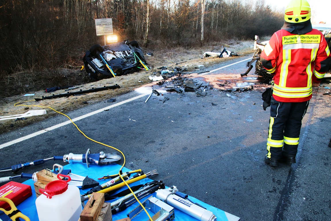 Bei dem Frontalzusammenstoß schleuderte der Toyota in den angrenzenden Graben und kam auf dem Dach zum Liegen. Der am Steuer befindliche 28-jährige Fahrer aus Oberfranken erlitt dabei tödliche Verletzungen.