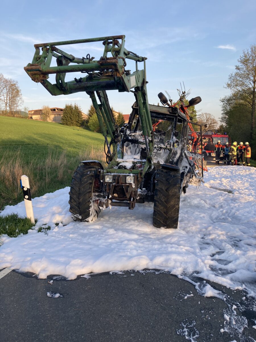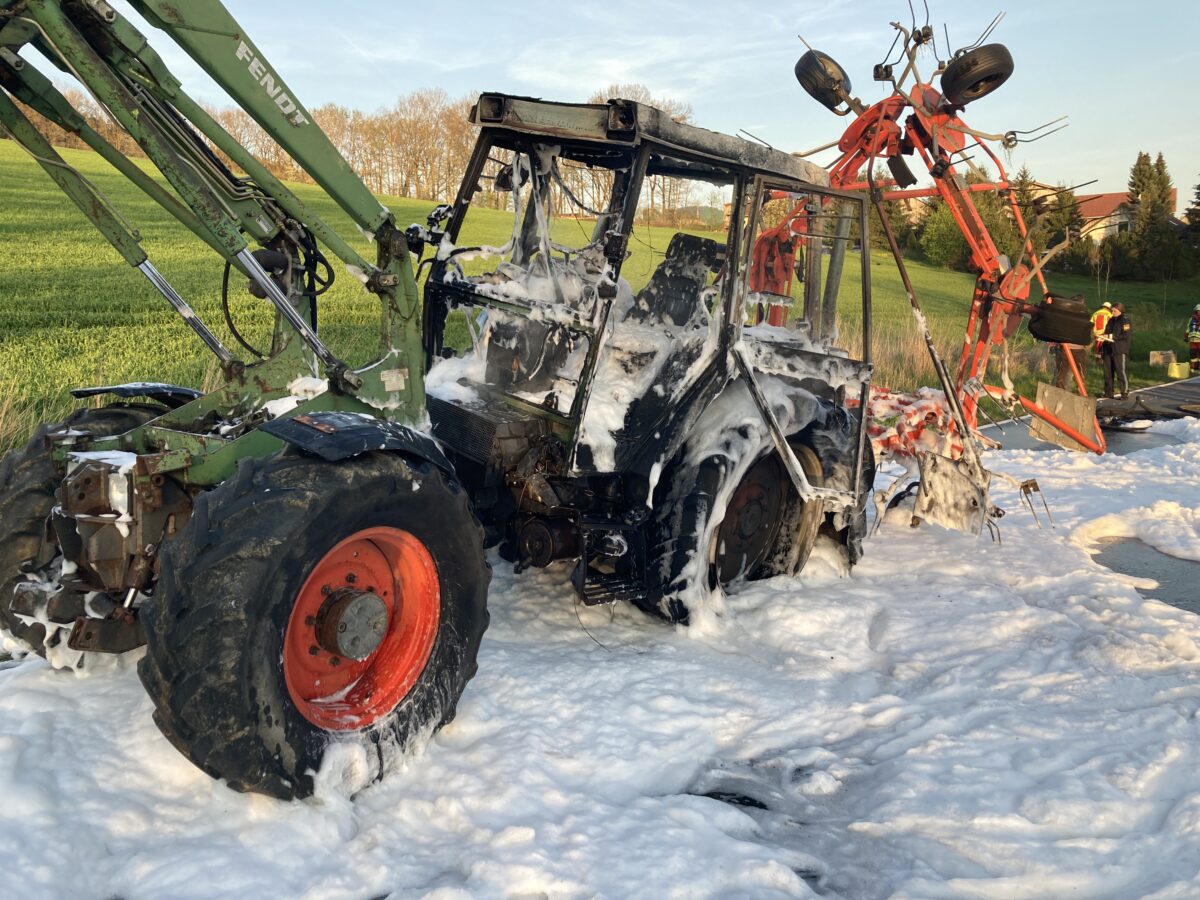 Traktor ausgebrannt – Anbaugerät und Straßenbelag ebenfalls beschädigt
