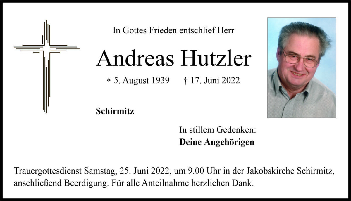 Traueranzeige Andreas Hutzler, Schirmitz 22. Juni 2022, 06:00 Uhr Von: redaktion Traueranzeige Andreas Hutzler, Schirmitz Landkreis Neustadt/WN Schirmitz