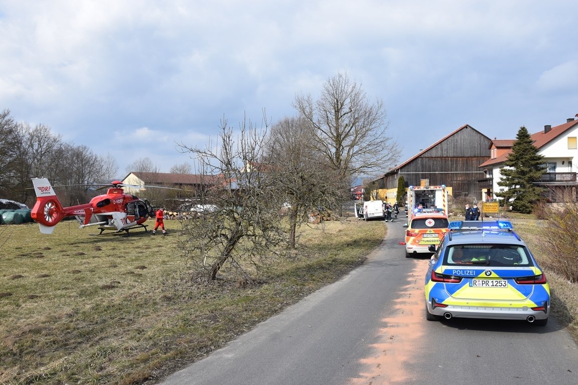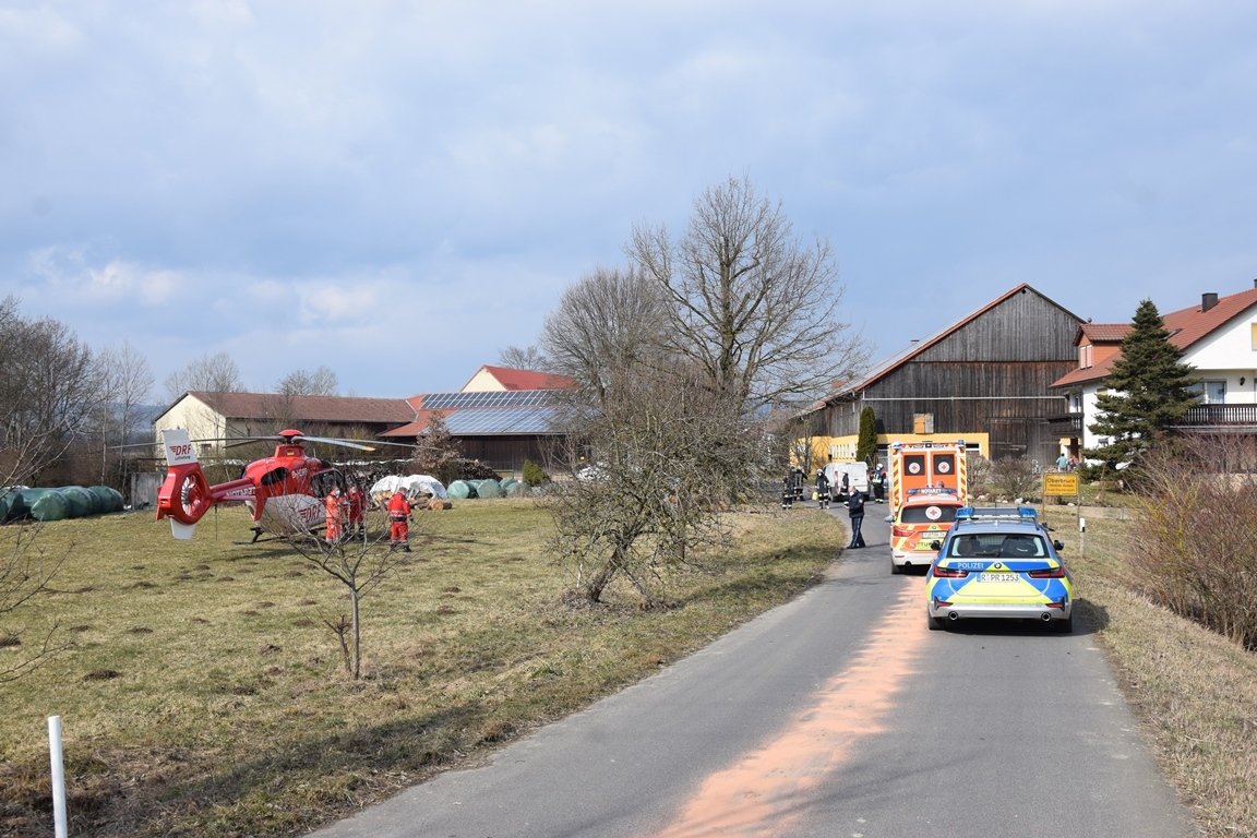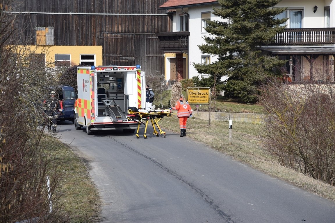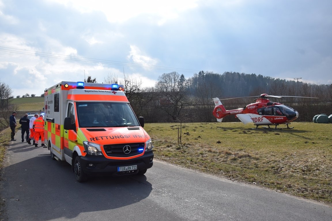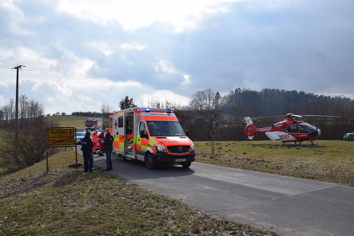 Gegen 13 Uhr am Dienstag waren viele Einsatzkräfte von Feuerwehr Kulmain, bis Rettungsbesatzung und Notfallauto der BRK-Rettungswache Kemnath im Einsatz. Schnell war der Kurierfahrer medizinisch erstversorgt. Seine Verletzungen am Kopf waren aber schwer: Das Rettungsteam hat ihn deshalb samt Rettungshubschrauber „Christoph80“ ins Krankenhaus gebracht.
