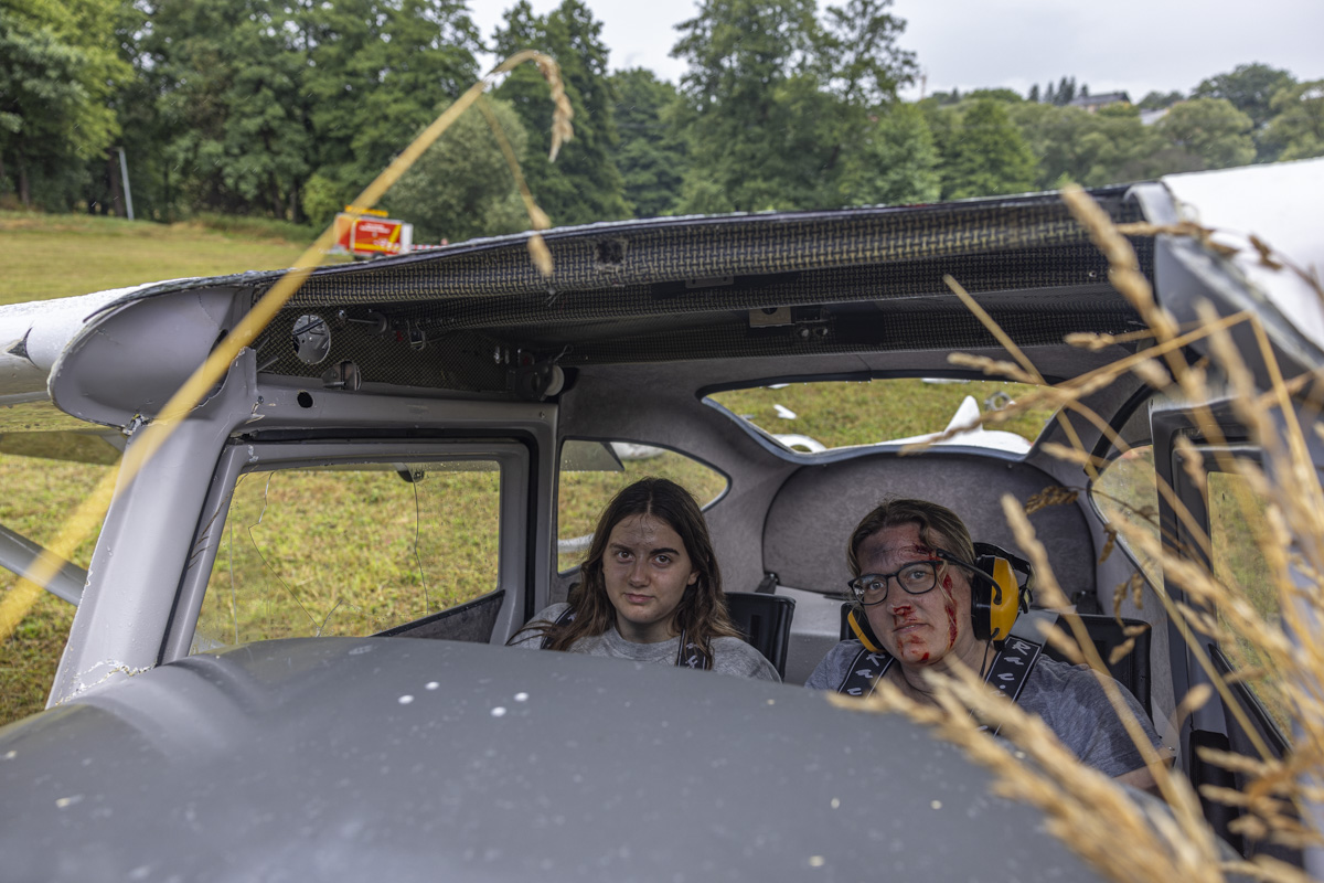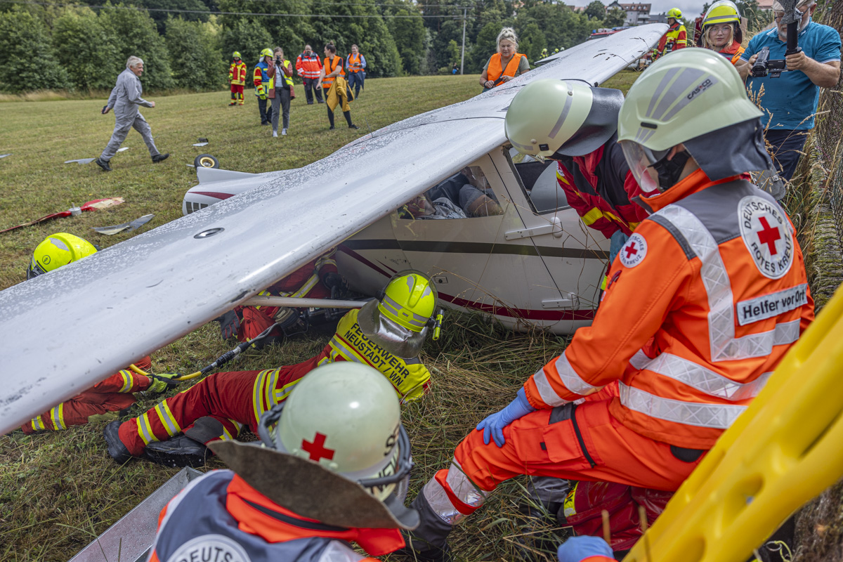 “Ich habe schon sehr viele Übungen durchgeführt und weiß daher, dass die Einsatzkräfte hier wirklich eine sehr gute Arbeit geleistet haben”, sagt Sachverständiger und Beauftragter der BFU, Hans Rachl. Die Retter hätten das Gefahrenpotential schnell erkannt, das Wrack sicher abgestützt, die Verletzten geborgen und den Sicherheitsbereich gut abgesperrt. Auch seinen angesetzten Störer hätten die Sicherungsposten vom Heck des Flugzeugs ferngehalten. Hier könnte bei einem echten Absturz der Raketenantrieb des Fallschirms herausschießen.