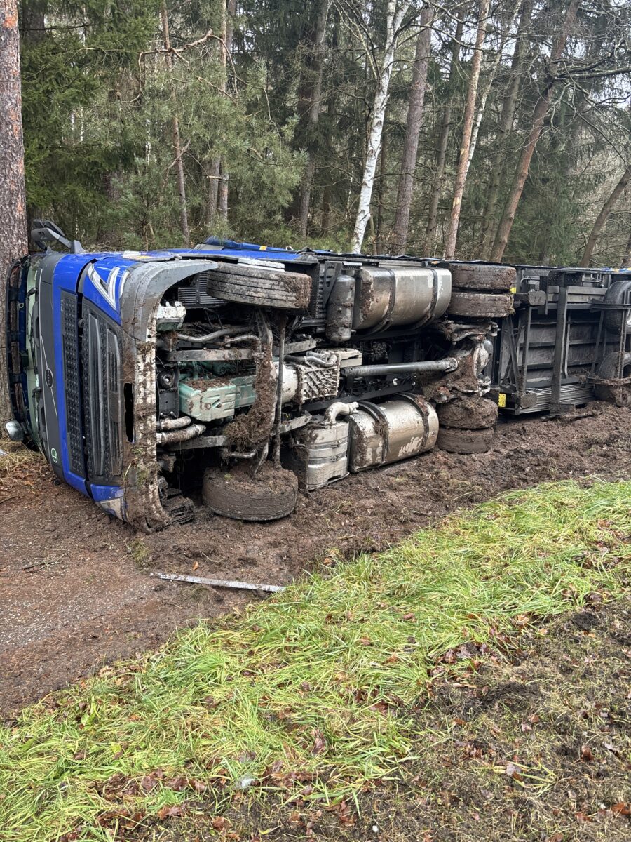 Das Fahrzeug rutschte einen zwei Meter tiefen Graben hinab und kippte nach etwa 50 Metern auf die rechte Seite. Glücklicherweise blieb der Fahrer unverletzt. Allerdings entstand ein Sachschaden in Höhe von 50.000 Euro am Lastwagen und an der Straßenböschung. Für die Bergung des Sattelzugs musste eine Spezialfirma angefordert werden.