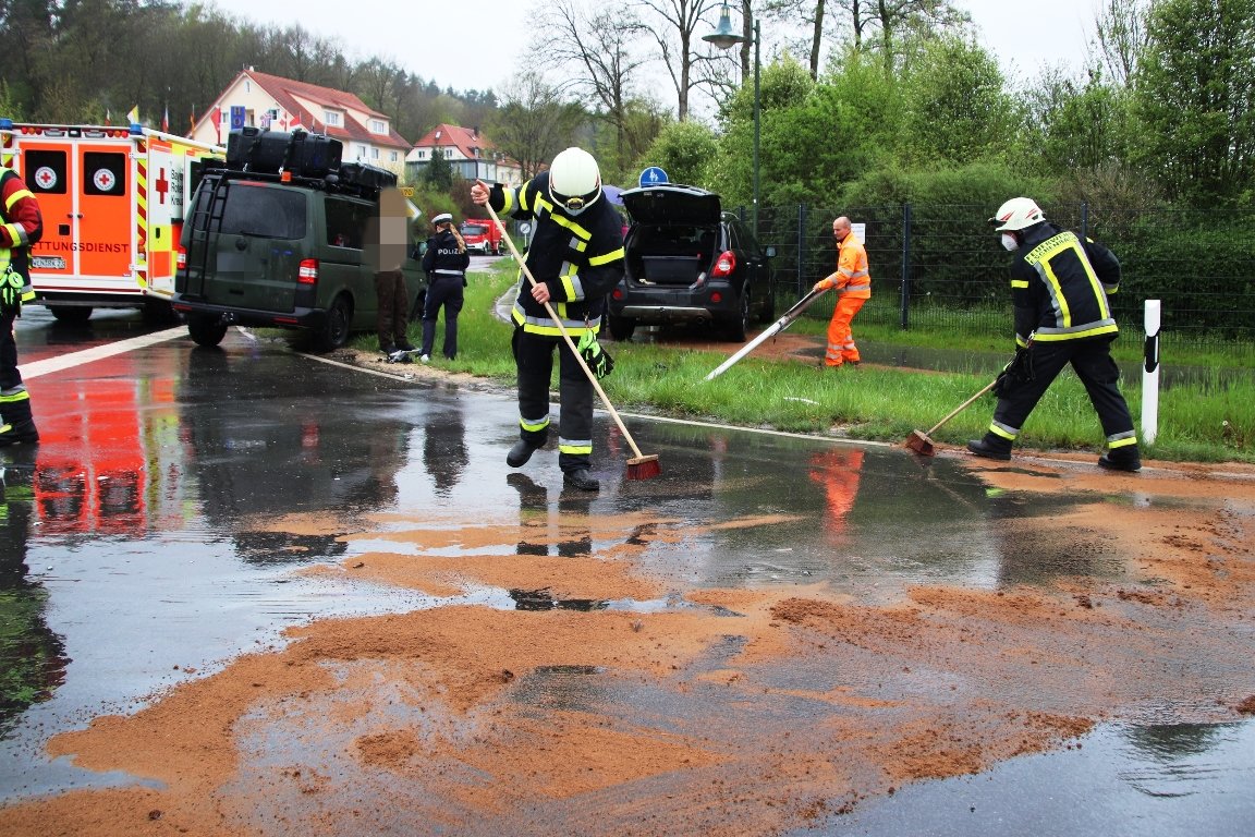 Sein VW Bus war noch fahrbereit, sodass er diesen nach Hause bringen konnte. Der Opel musste abgeschleppt werden. Die Polizeibeamten schätzten den Gesamtschaden auf rund 25.000 Euro. Die Feuerwehr Eschenbach reinigte im strömenden Regen die Fahrbahn und sperrte die B470 halbseitig ab.