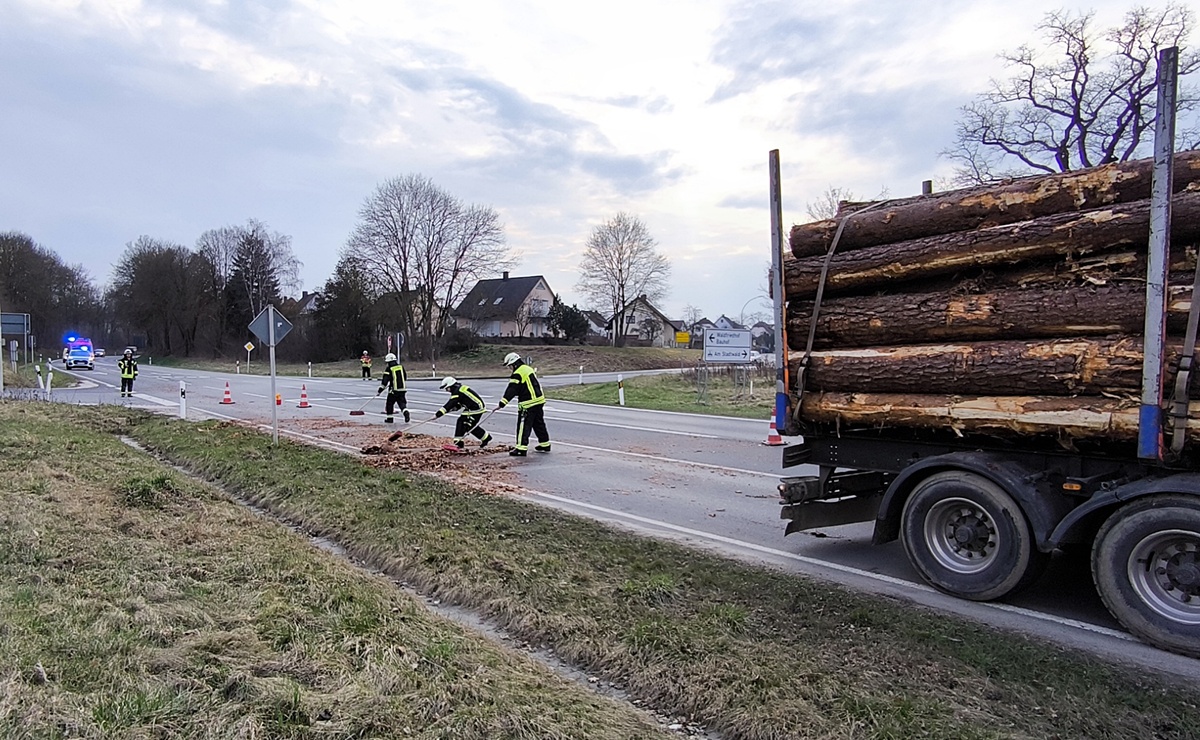Glücklicherweise wurde weder der Pkw getroffen, noch fielen Holzstämme auf die Fahrbahn. Verletzt wurde niemand.