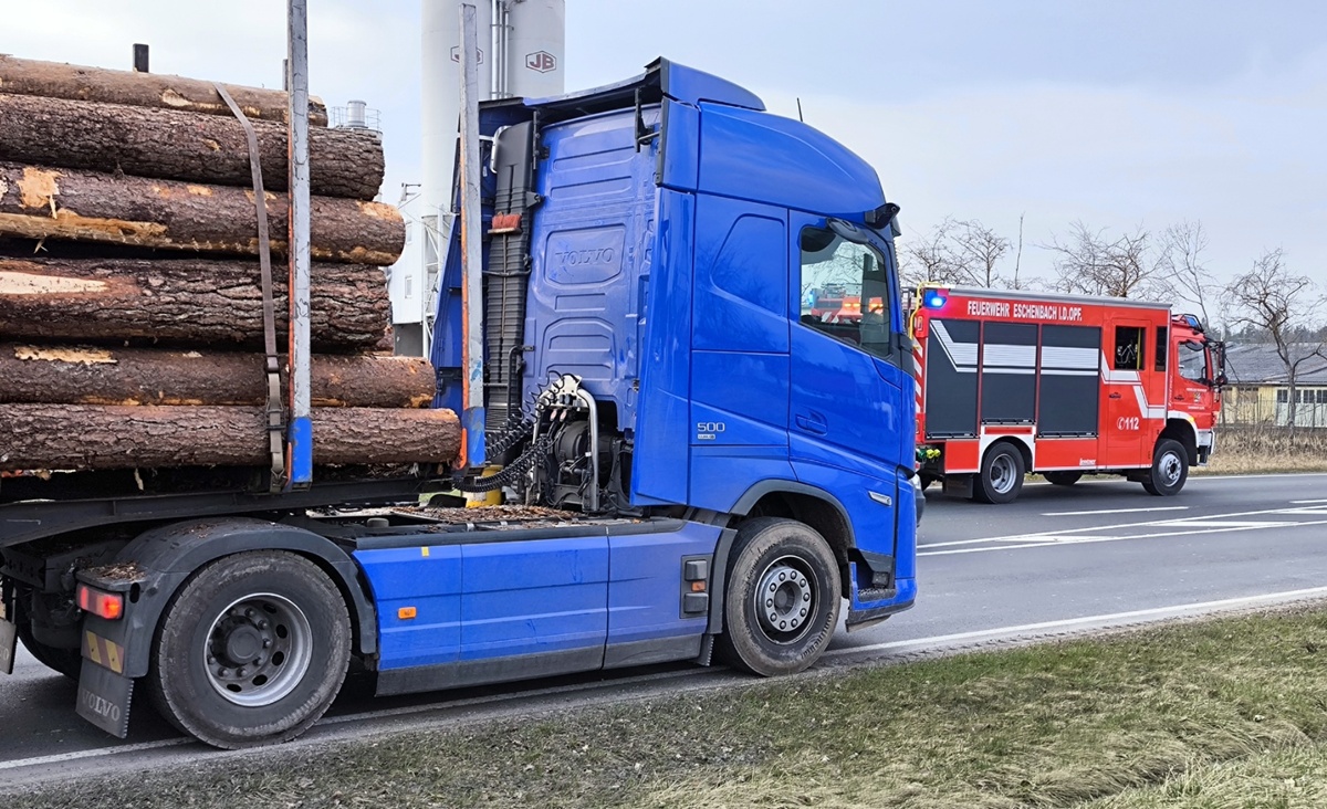 Der Lkw-Fahrer reagierte geistesgegenwärtig und leitete eine Vollbremsung ein, um einen Zusammenstoß zu verhindern. Dabei verrutschten die gesicherten Baumstämme auf dem Lastwagen sowie auf dem Anhänger und prallten gegen das Führerhaus.