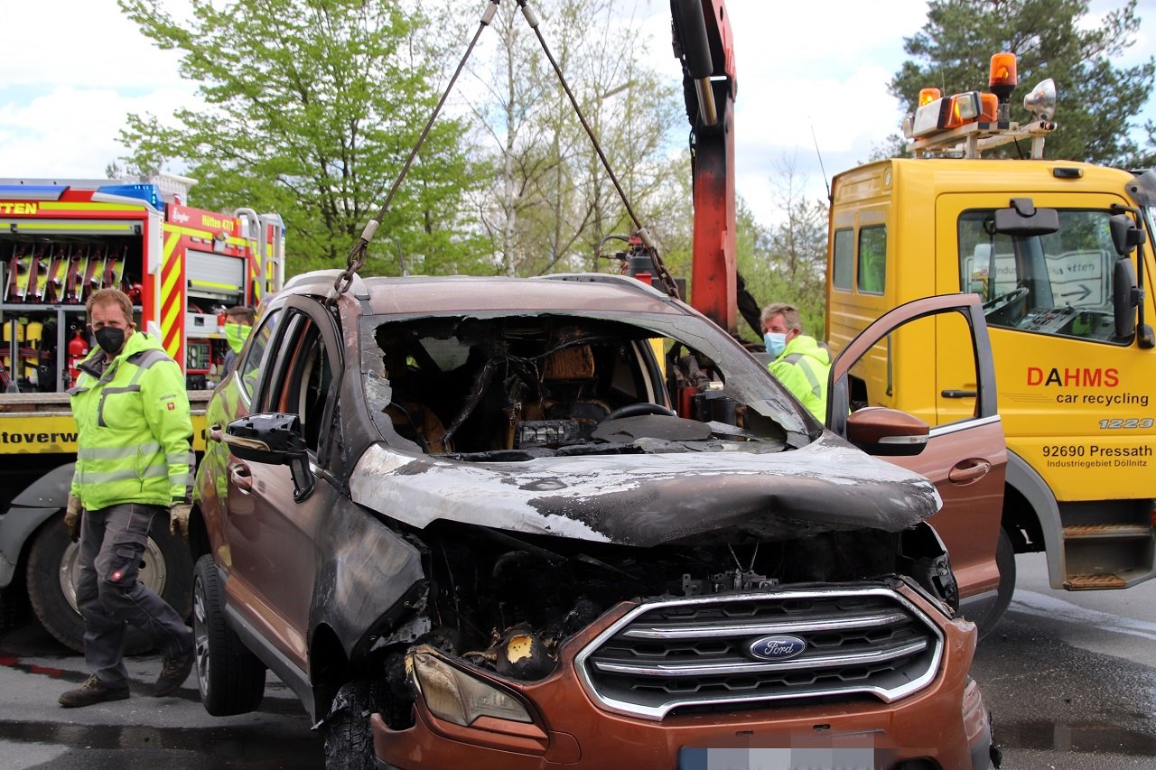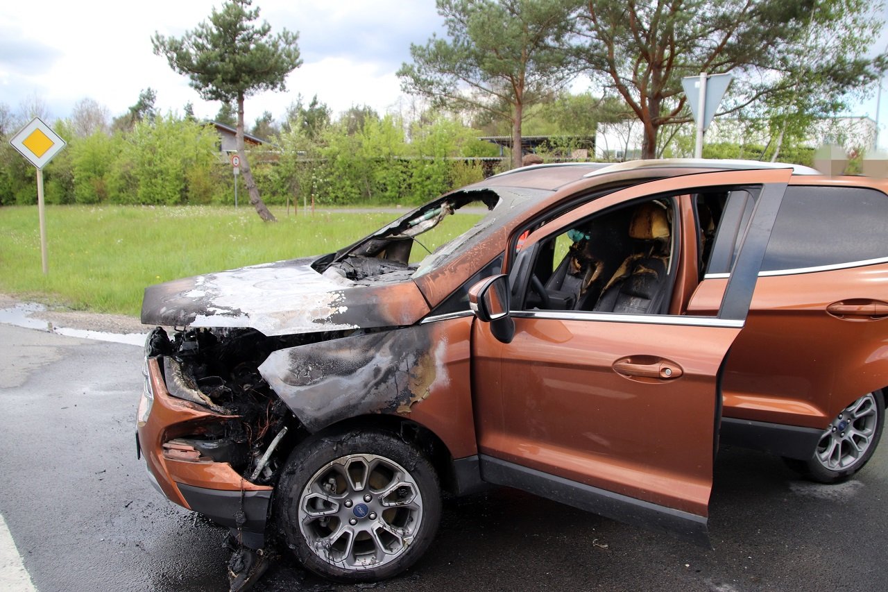 Die Insassen, zwei US Amerikaner und ein kleiner Hund, konnten das Auto glücklicherweise noch rechtzeitig verlassen. Der hinzugerufene Rettungsdienst versorgte sie – augenscheinlich blieben sie unverletzt. Der Ford jedoch brannte vollständig aus.