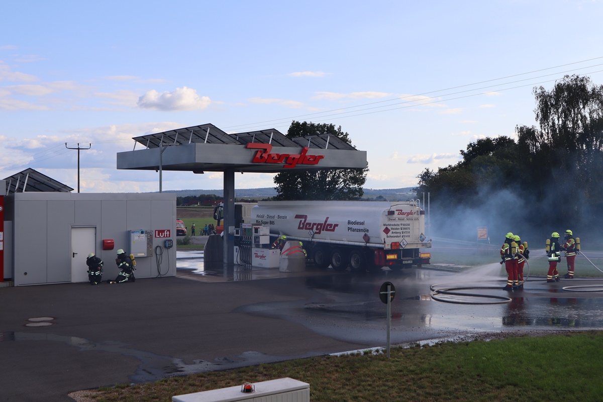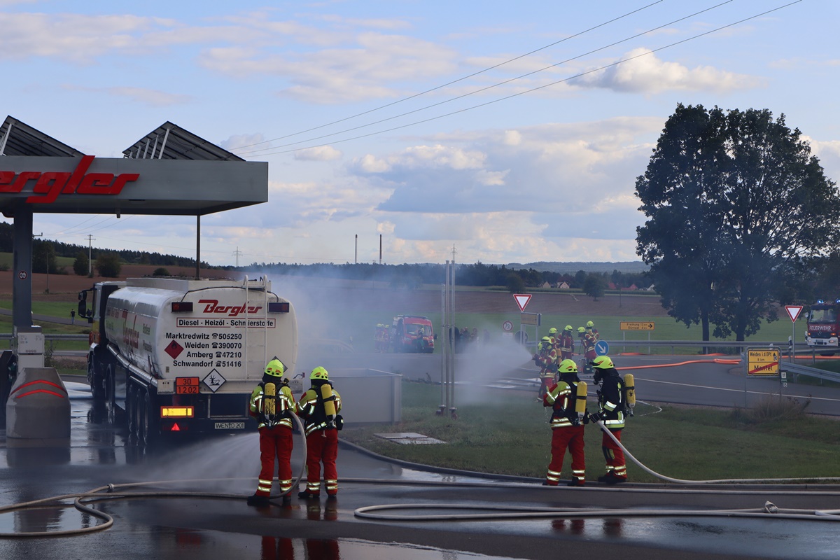 Angenommen wurde ein Brand eines Tanklastwagens direkt an der Tankstelle der Firma Bergler in Mantel. Zudem wurden an dem Tankstellenbereich drei Personen vermisst. Um 16.14 Uhr erfolgte durch die Integrierte Leitstelle die Alarmierung per digitalem Pager und Sirene.