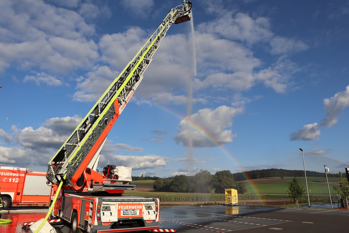 Nach etwa 50 Minuten konnte durch den Einsatzleitung Übungsende verkündet werden und die Einheiten bauten die Gerätschaften komplett wieder zurück und fanden sich danach am Parkplatz des Netto-Marktes ein, für eine kurze Abschlussbesprechung durch den Kommandanten Timo Krauß. Hierbei galt ein besonderer Dank an Gerhard Bergler, der extra für diese Übung einen Tanklastwagen als auch die Tankstelle zur Verfügung gestellt hat.