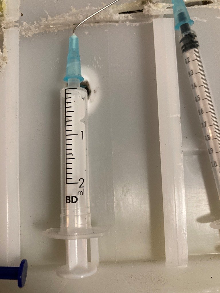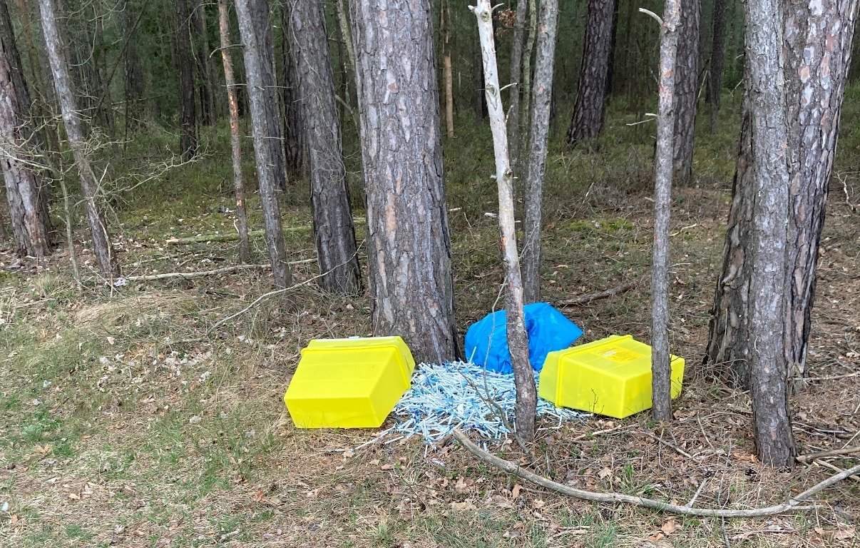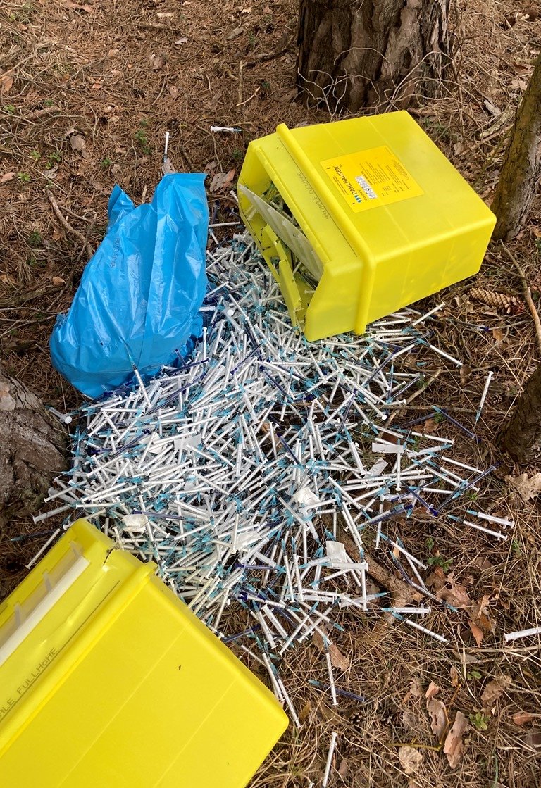 Die Behälter waren aufgegangen und der Inhalt – etwa 800 benutzte Einwegspritzen – waren auf dem Waldboden verstreut. Laut Angaben der Polizei soll es sich um drei verschiedene Spritzenmodelle handeln. Die Größen variieren von einem bis zwei Millilitern.