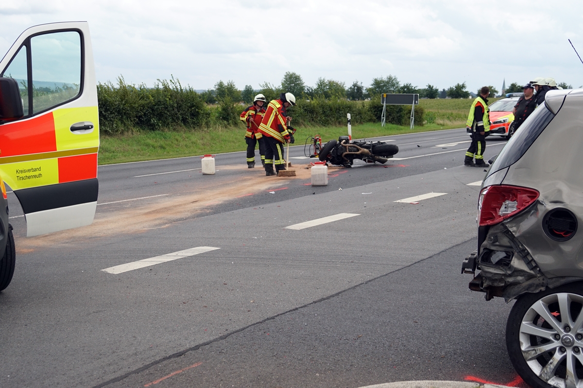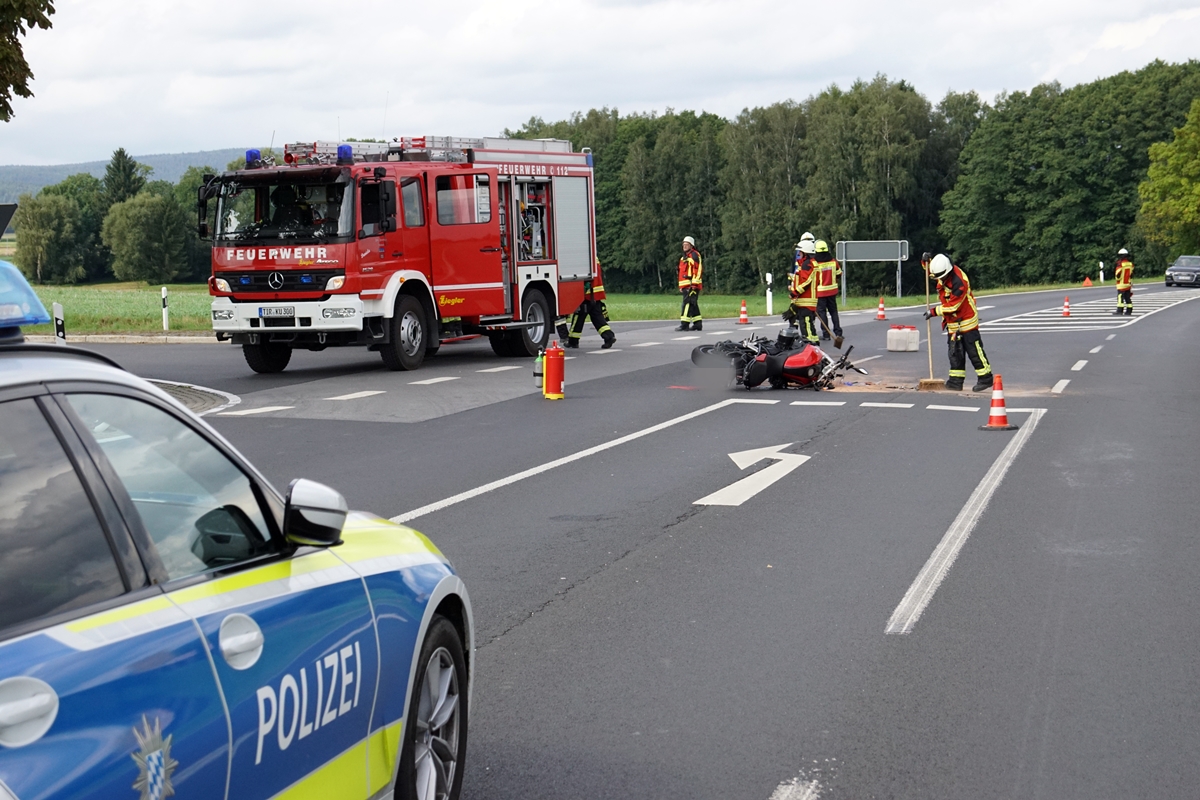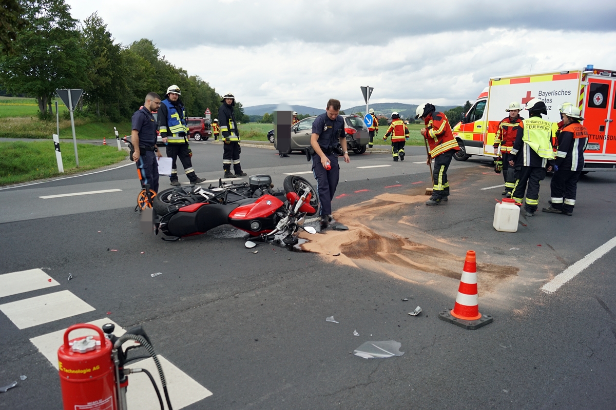 Gegen 14.45 Uhr stießen bei der Abzweigung nach Immenreuth ein Opel und ein Motorrad zusammen. Der 83 Jahre alte Autofahrer wollte aus Richtung Kemnath kommend nach links in Richtung Immenreuth abbiegen. Aus Unachtsamkeit übersah der Fahrer den entgegenkommenden Motorradfahrer aus dem Nürnberger Land. Im Kreuzungsbereich prallte die BMW mit hoher Geschwindigkeit in das Heck des abbiegenden Opel.