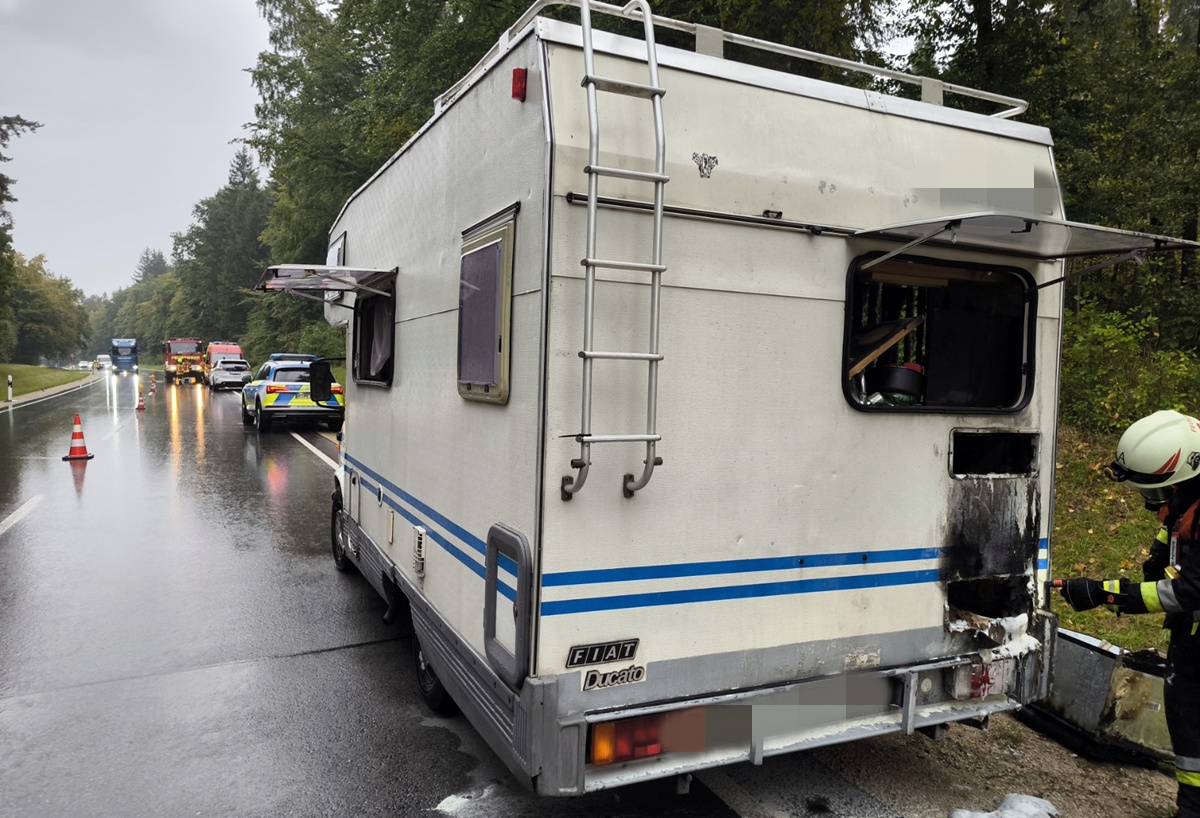 Die alarmierten Feuerwehrkräfte löschten unter schwerem Atemschutz die noch vorhandenen Glutnester. Glücklicherweise blieb die Fahrerin unverletzt. An dem Wohnmobil entstand jedoch ein wirtschaftlicher Totalschaden. Aufgrund des Einsatzes und bei strömendem Regen musste die Bundesstraße 470 für etwas über eine Stunde teilweise gesperrt werden.