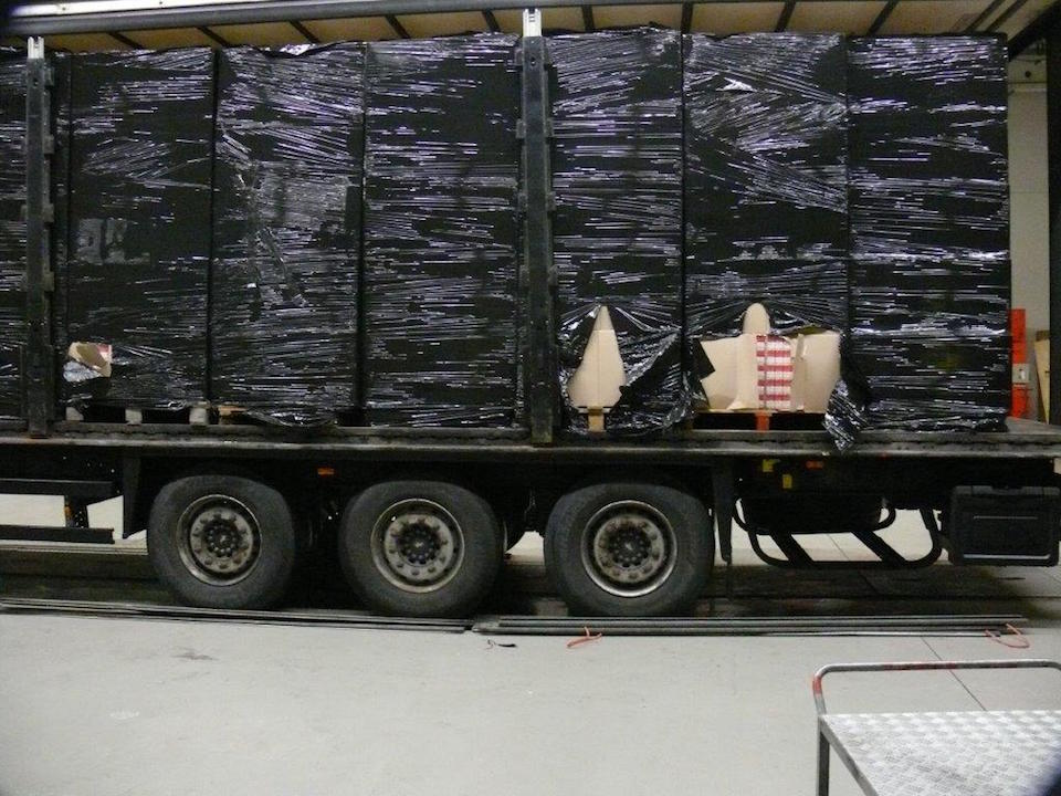Die tatsächliche Ladung stimmte allerdings nicht mit den Angaben in den Papieren überein: Die erfahrenen Zöllner unterzogen den Auflieger einer Röntgenkontrolle und stellten mit geschultem Blick zigarettenähnliche Strukturen in der Ladung fest. Auf der Ladefläche des Aufliegers befanden sich Paletten, auf denen in schwarzer Folie eingewickelte Kartons gestapelt waren. Die Zöllner öffneten zunächst mehrere Kartons und fanden darin nur Zigaretten, von Geschenkpapier keine Spur.