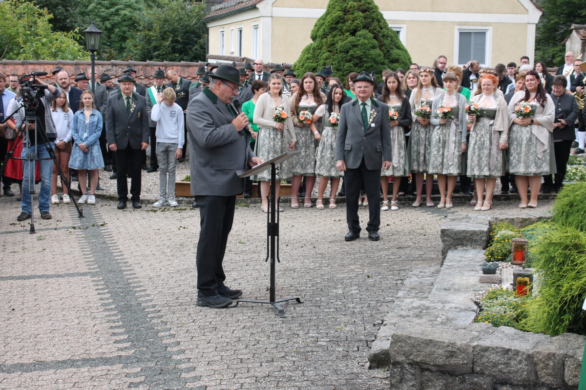 Höhepunkt des Wochenendes war freilich der Sonntag, der mit einem Kirchenzug von Preißach nach Burkhardsreuth und einem Totengedenkakt am Gefallenenehrenmal begann. Stellvertretend für alle in die Ewigkeit abberufenen Mitglieder gedachte Schützenmeister Hans Hey des im März verstorbenen Ehrenvorstands Heinrich Bauer, dem die Jubiläumsvorbereitungen noch in seinen letzten Lebensmonaten am Herzen gelegen hatten. In seiner Predigt zum Festgottesdienst, der von der Dießfurter Musikkapelle begleitet wurde, stellte Pfarrer Edmund Prechtl der kommerziell ausgeschlachteten, teilweise „religiös“-überzogen anmutenden Fußballbegeisterung, die sich in fragwürdigen Ausdrücken wie „Fußballgott“, „Fußballtempel“ oder „heiliger Rasen“ widerspiegelt, das Ethos der „Tannenzweig“-Gründer gegenüber.
