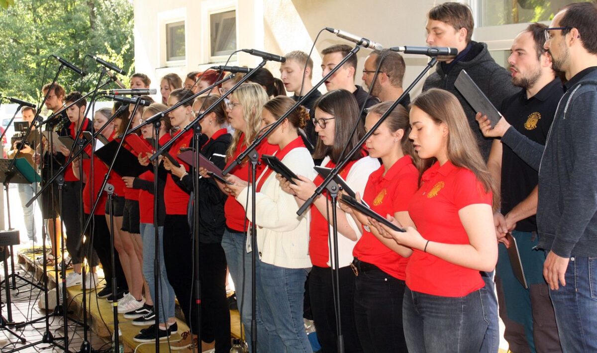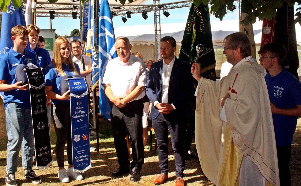 Der Teeniechor unter der Leitung von Wolfgang Ziegler begrüßte die Gottesdienstbesucher am Freialtar. Der Geistliche feierte mit den Gläubigen den Festgottesdienst. Nach dem Segen für die Menschen stellte Thomas Stohldreier die beiden Fahnenbänder unter den Schutz Gottes – das Band zu Ehren der Verstorbenen in Schwarz und in Blau, das zum 100-jährigen Jubiläum. Weiter segnete Stohldreier den Neubau des Lagergebäudes und die vollautomatische Rasensprinkleranlage, die im Fußballplatz versenkt liegt.