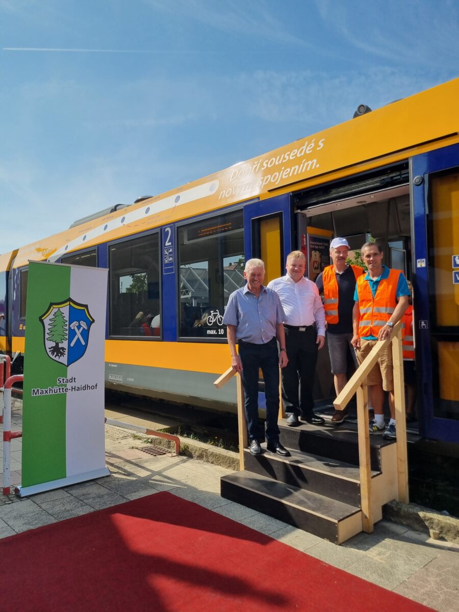 Der Bahnhof präsentierte sich in den Stadtfarben Grün-Weiß und die Jugendblaskapelle der Freiwilligen Feuerwehr Leonberg sorgte für die musikalische Untermalung. Besonders berührend war der Moment, als der nachfolgende Schienenbus Vt98 der Passauer Eisenbahnfreunde mit dem Steigerlied verabschiedet wurde, “welches ja zu Maxhütte-Haidhof gehört wie Schlegel und Eisen im Wappen der Stadt”. Gäste hatten zudem in Teublitz die Möglichkeit, zuzusteigen, bevor es weiter nach Burglengenfeld ging, wo die Klänge der Blaskapelle von St. Vitus warteten.