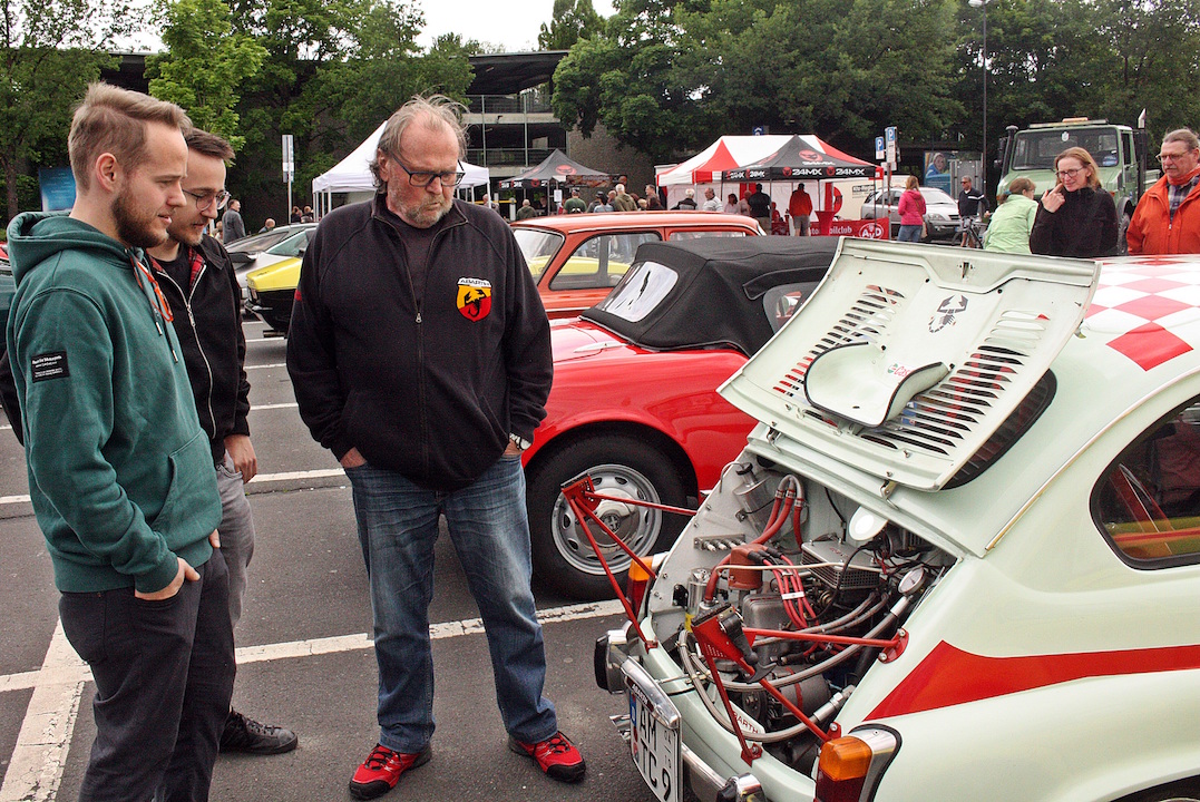 Hier stellten sich die Fahrzeuge auf, es gab genügend „Benzingespräche“ zwischen Oldtimerbesitzern und den Gästen. Die Fahrer und Beisitzer waren wirklich gefordert, denn sie durften den vielen Interessierten ihre Raritäten vorstellen, Besonderheiten und technische Merkmale erläutern.