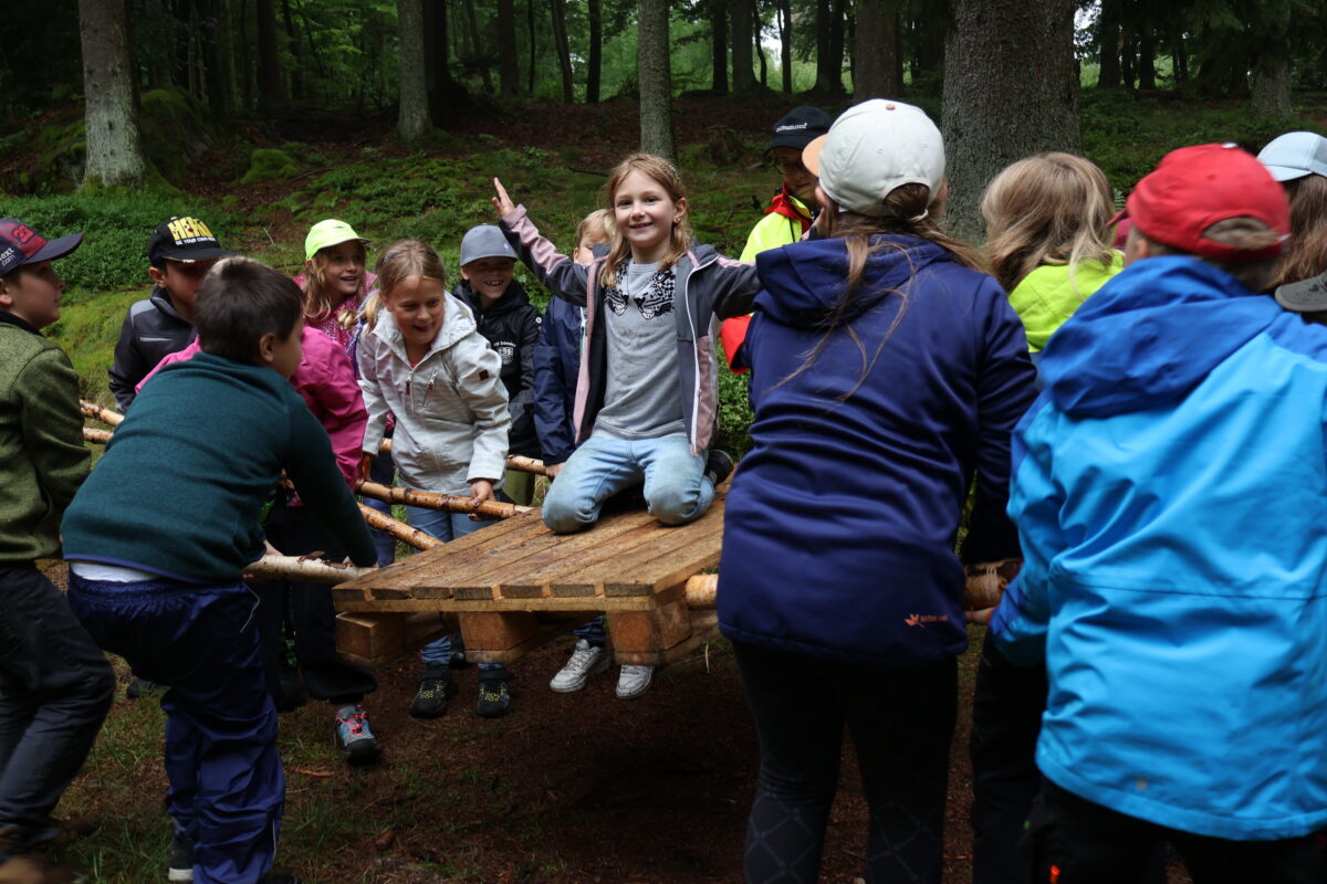 An zwölf Stationen konnten die Kinder ihr Wissen aus dem Unterricht anwenden – und ganz neue Seiten am Wald entdecken. Mit vereinten Kräften bauten sie am „Dachstuhlpuzzle“ aus Holzbalken einen echten Dachstuhl nach. Beim „Gabelstaplerspiel“ hoben sie mit kleinen Birkenstämmen eine Palette samt Klassenkameradin an. Hier war Koordination und Muskelkraft gefragt – aber vor allem Zusammenhalt.