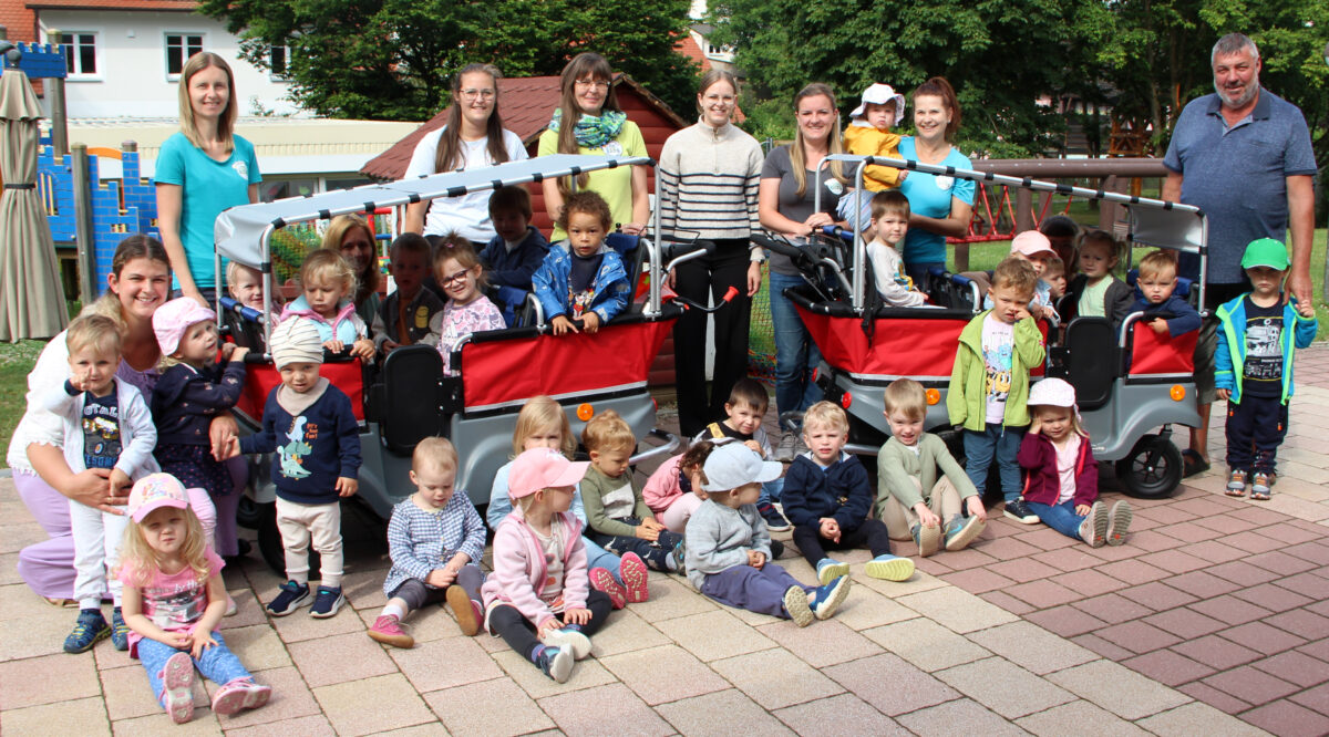 Die motorisierten Busse für bis zu sechs Kinder lassen sich sehr leicht lenken, haben eine einfache Bedienung und nehmen jede noch so unüberwindbare Steigung mit einer Leichtigkeit. Durch die Spende von zwei E-Kinderbussen (12 Sitzplätze) kann jetzt eine Krippengruppe gemeinsam entspannt kleine Ausflüge unternehmen. Die Krippenwägen werden in Absprache schon fleißig von der „Glühwürmchen-, Bienen- und Wichtelgruppe“ benutzt.