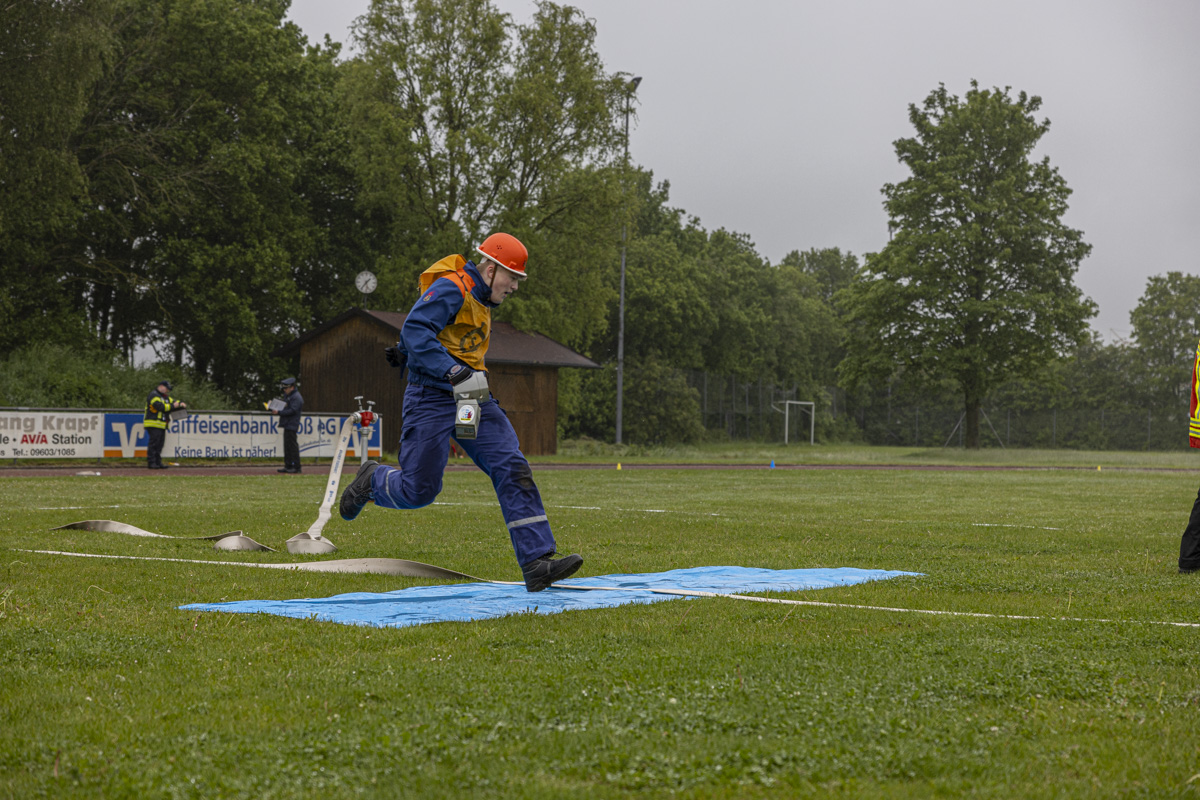 Beim Staffellauf mussten neun Läufer ein Staffelholz von Station zu Station befördern. Dort wurde das Aufrollen eines Schlauches, das Anziehen von Ausrüstung oder unter anderem das Werfen eines Leinenbeutels erledigt werden.