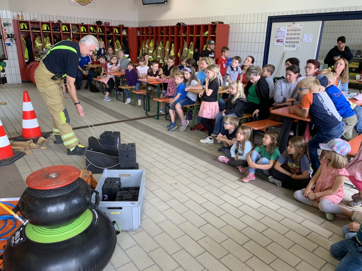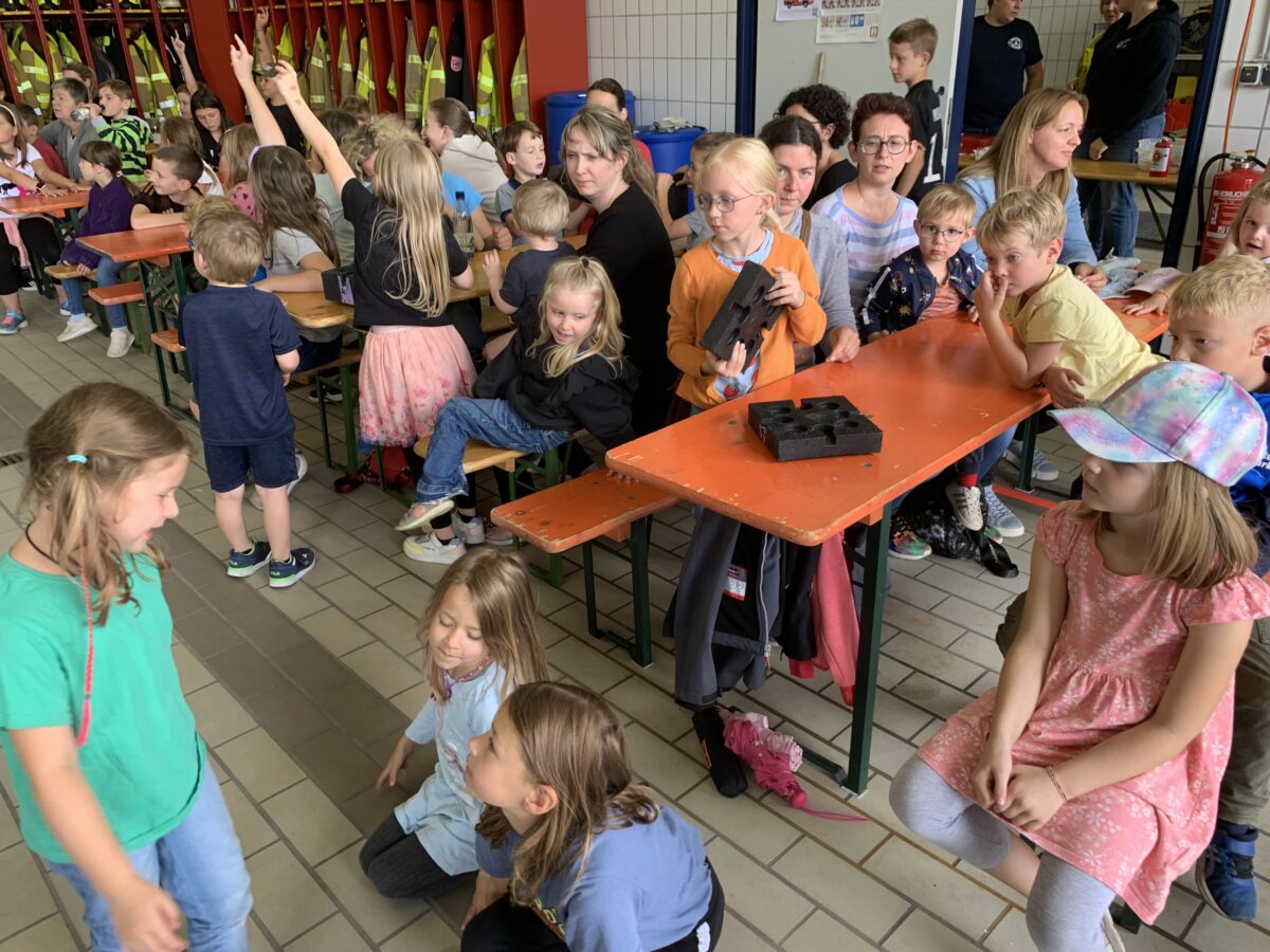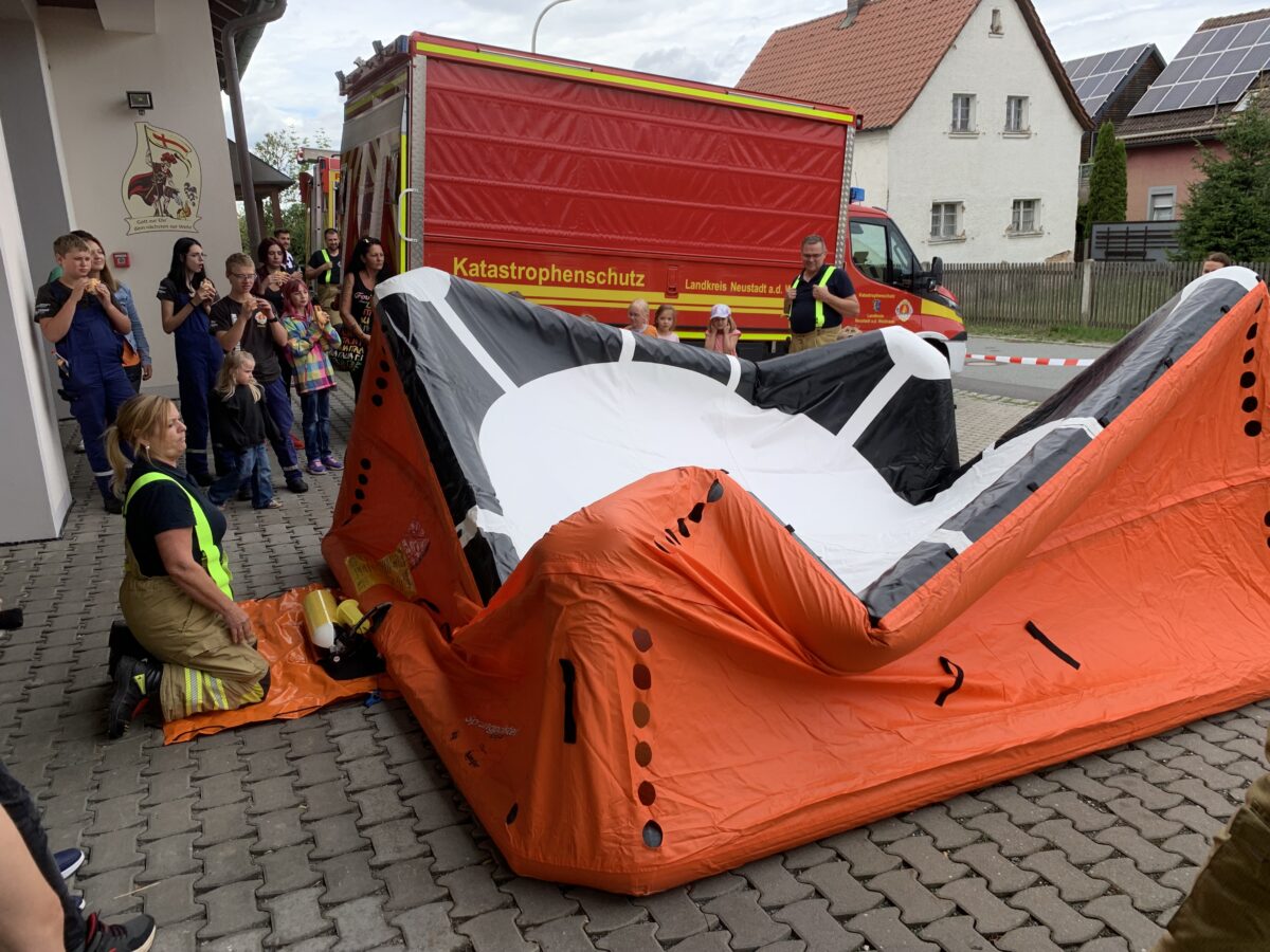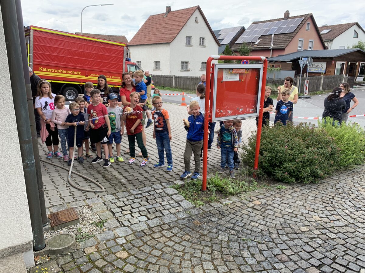 Ein großes Hallo gab es beim Aufblasen des Sprungpolsters. Dabei hieß es, Abstand zu halten. Nach den Vorführungen spritzen die Kinder mit einem Schlauch auf das kleine Holzhaus. Zur Stärkung gab es kostenlose Muffins, Wiener und Semmeln mit Getränken.