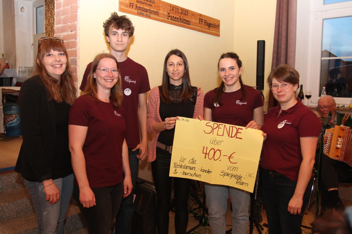 Die Festdamen, -burschen und -kinder der Hagendorfer Feuerwehr können sich zum 125-jährigen Gründungsjubiläum freuen. „Bei der Einweihung des Bergmannsspielplatzes ist Geld übrig geblieben“, sagte Vera Stahl und überraschte die jungen Leute zusammen mit Corinna Neuber, Julia Selch und Marina Schmalnauer vom Spielplatzteam im Rahmen des Heimatabends im ehemaligen Schulhaus mit 400 Euro. „Das Geld können wir für die Anschaffung von Festkleidung verwenden“, strahlte Lisa Kreuzer, als sie sich für die Spende bedankte.