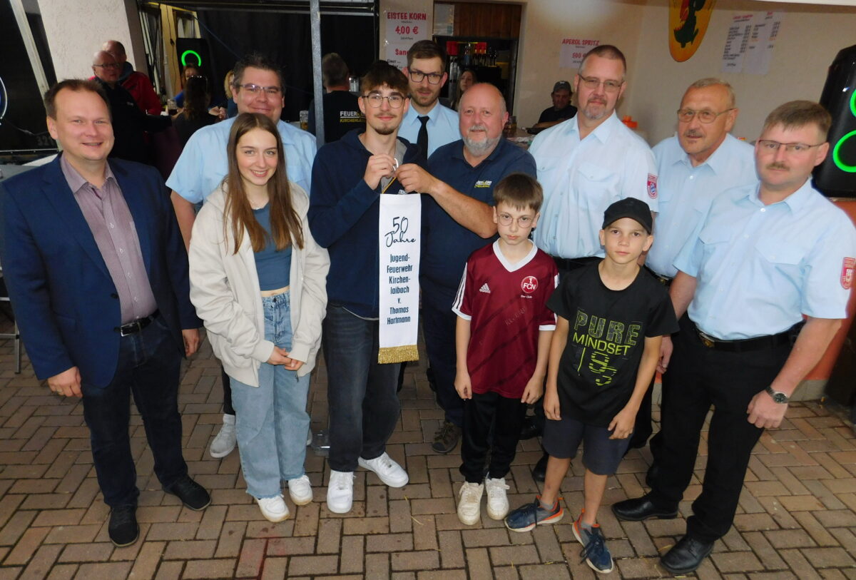 Nicht unerwähnt blieb der Beitrag der Jugendfeuerwehr zur Geschichte von Kirchenlaibach, darunter der Jugendleistungsmarsch, der hier seinen Ursprung fand. Zum Jubiläum gab es für die Gründungsmitglieder Urkunden, einen Jubiläumspokal sowie weitere Geschenke zur Erinnerung. Ehrenkommandant Thomas Hartmann stiftete zudem ein Fahnenband “zur Erinnerung an das 50-jährige Bestehen der Jugendfeuerwehr”, das er der Anwärtertruppe um Luca Kümmerl überreichte.