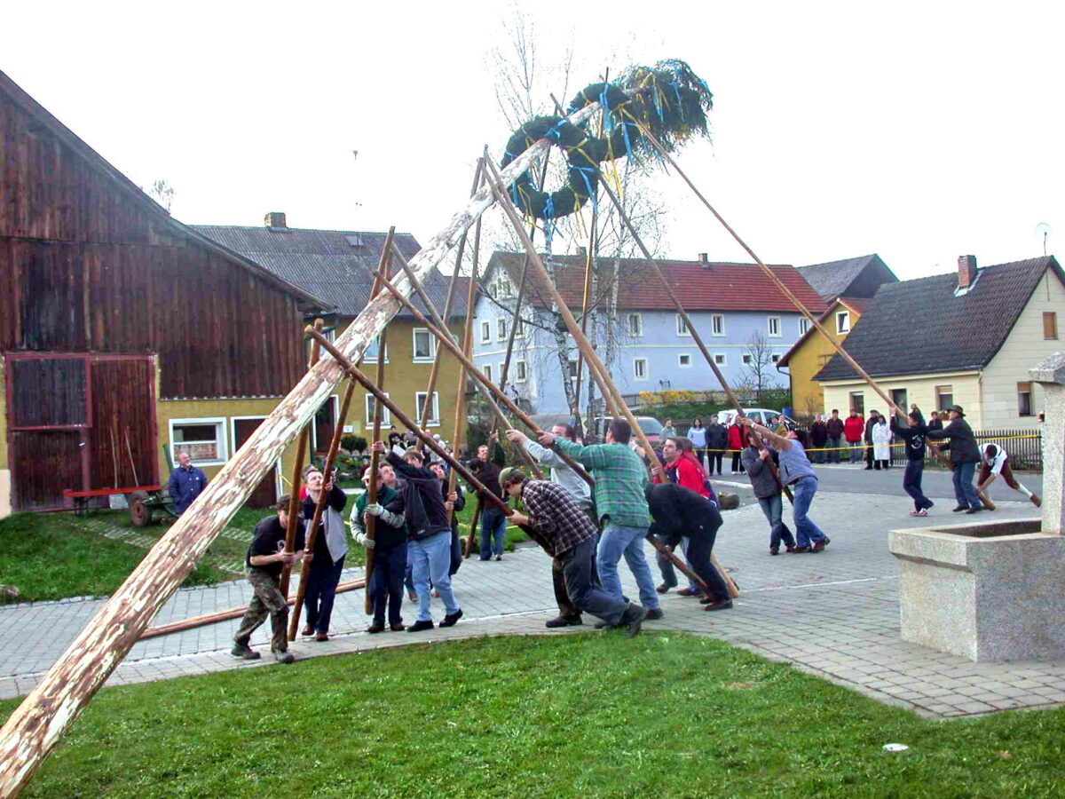 Das Aufstellen des Maibaums, ein Symbol des Lebens und des Frühlings, wird von der Gemeinschaft als wichtiger kultureller Akt gesehen. Früher baten oberpfälzische Holzfäller den Baum um Verzeihung, bevor sie ihn fällten – ein Brauch, der die tief verwurzelte Verbundenheit zur Natur symbolisiert. Der aus dem Wald geholte Fichtenstamm wird geschält, mit bunten Bändern und zwei Kränzen geschmückt und dann in aufwendiger Tradition auf dem Dorfplatz aufgestellt.
