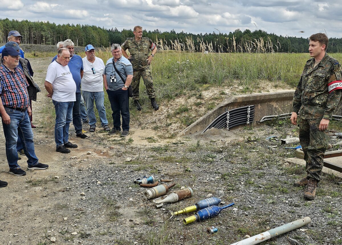 Die Führung der Exkursion übernahm Oberstabsfeldwebel Schmid. Die Teilnehmerinnen und Teilnehmer wurden an zahlreichen bedeutenden Punkten vorbeigeführt, darunter der markante Wasserturm – das Wahrzeichen des Truppenübungsplatzes und der Stadt Grafenwöhr. Sie besichtigten Truppenlager, verschiedene Schießbahnen und die Wolfschützenkapelle. An einer Schießbahn erläuterte Hauptfeldwebel Plechschmidt die verschiedenen Munitionsarten, die für Übungen verwendet werden.