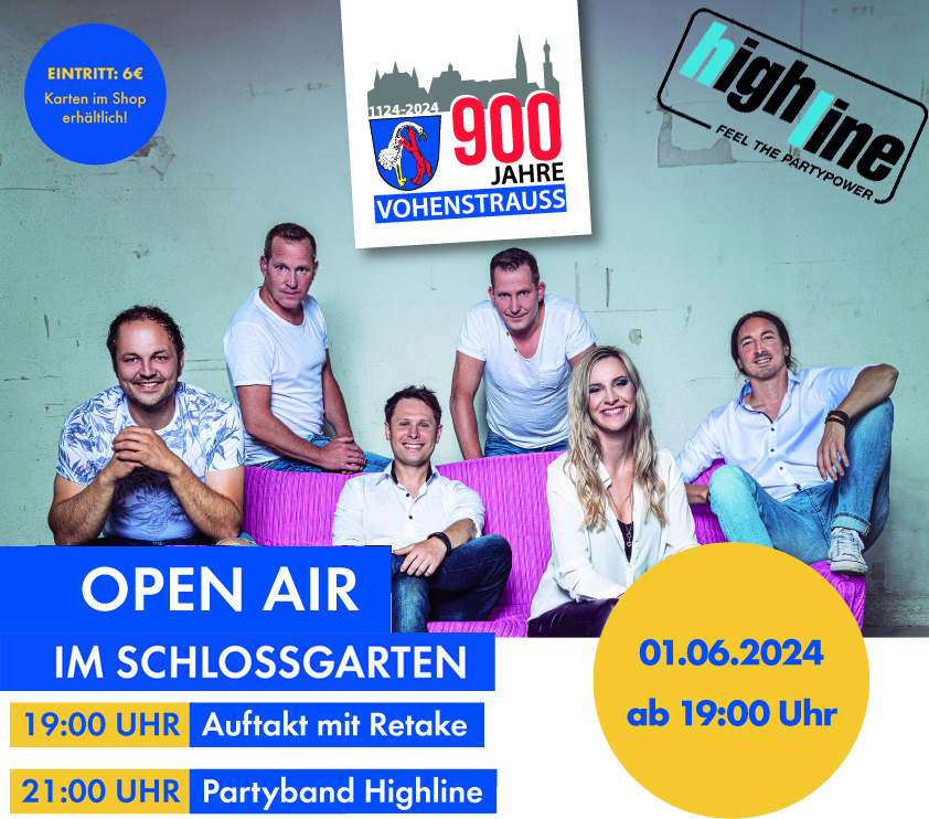 Das Open-Air-Konzert im Schlossgarten eröffnet die Musikinitiative Vohenstrauß mit der Band „Retake“. Für ausgelassene Partystimmung sorgt am Höhepunkt des Abends die Band „Highline“.