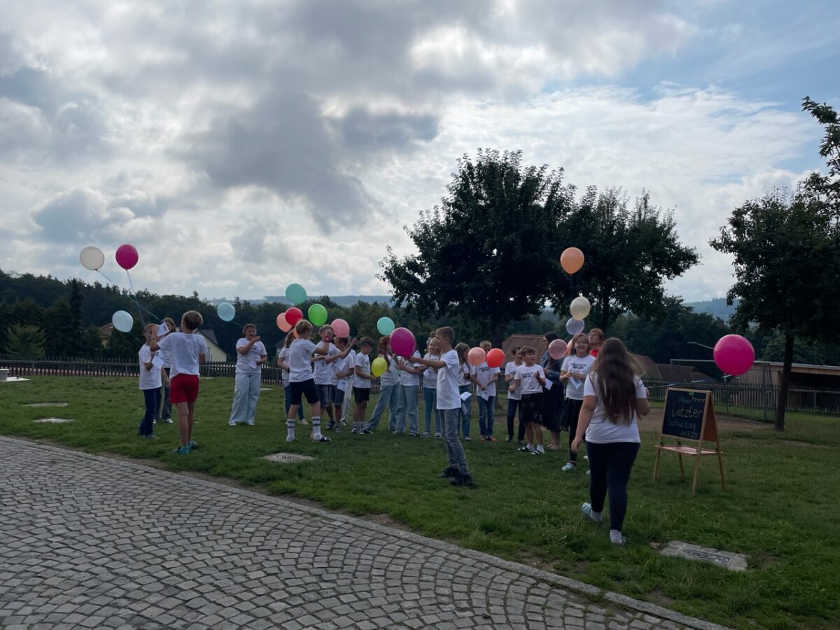 Zum Abschluss ließen die Kinder gemeinsam Luftballons steigen. Die scheidenden Schüler trugen T-Shirts mit der Aufschrift „Wir machen den Abflug“ und baten ihre Freunde, sich darauf zu verewigen, zu signieren.