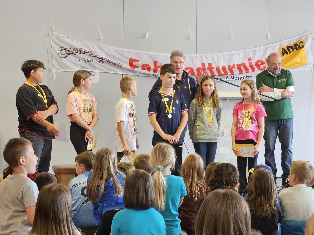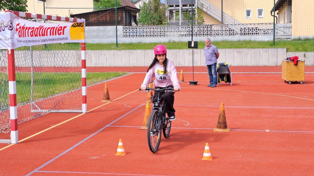 Immerhin ein Schüler schaffte den Parcours ohne Fehlerpunkte und mehrfach musste bei Punktgleichheit die Slalomzeit entscheiden. Alle Schüler erhielten eine Teilnehmerurkunde, ein Lineal mit Verkehrszeichen und ein informatives Fahrradheft, mit dem sie einen persönlichen Fahrradpass erstellen können. Die jeweils drei besten Mädchen und Buben jeder Gruppe bekamen zusätzlich bei der Siegerehrung in der Aula noch Plaketten am Band in Gold, Silber oder Bronze.