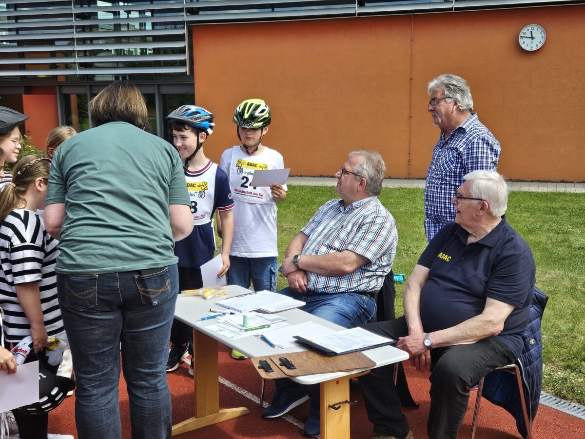 ADAC-Vorsitzender Karl Seiler und Schriftführer Rainer Roll brachten mit vier weiteren Helfern das notwendige Material für den Parcours auf den Allwetterplatz der Mittelschule. Dort galt es dann, nach einer kurzen Fahrradkontrolle vor dem Start, zuerst über ein Spurbrett und dann einhändig um einen Kreisel rechts zu fahren.