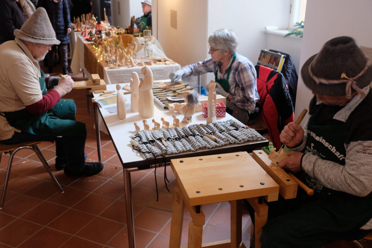 Die Besuchermassen staunten zudem über Arbeiten der Studierenden der OTH Amberg-Weiden zum Thema „mittelalterliche Buchmalerei & künstliche Intelligenz“. Statt Krempel beeindruckte redliche Handwerkskunst aus Naturhölzern, Papier, Stoff, Wolle und Stroh. Auch Bastel-Workshops und Erinnerungen an die „Weihnachtszeit früher“ stießen auf viel Interesse. Im Gschichtn-Stüberl lauschte das Publikum über Weihnachtserzählungen und Bräuche aus früheren Zeiten. In der Wieskapelle beeindruckte eine Krippen-Performance.