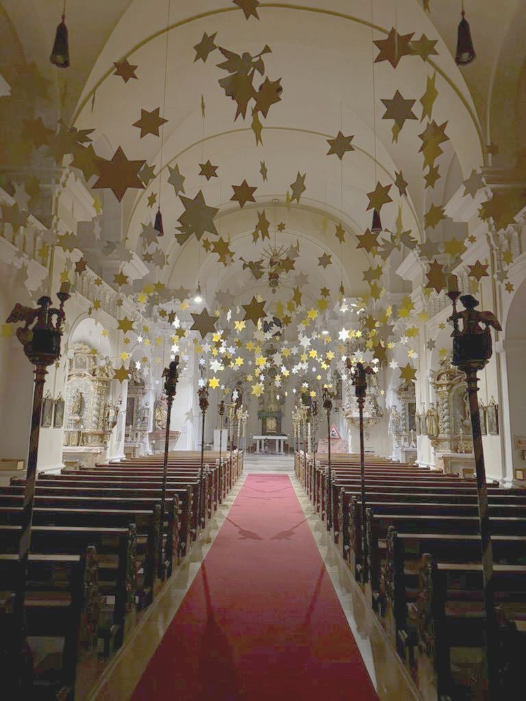 Die Idee zu dieser großartigen Aktion hatte vor zwei Jahren die Kirchenpflegerin Nicola Hummer. Inzwischen hängen in der Adventszeit rund 600 Sterne und 20 silberfarbene Engel in der Kirche. Die Himmelskörper entstanden in einer Bastelaktion mit den Ministranten. Nicht leicht war das Aufhängen der Sterne und silberfarbenen Engel von einer Empore zur anderen. „Es war spannend, ob wir es schaffen werden, die vielen Sterne und Engel in unserer Kirche zu platzieren.“ Allein hätte es die Kirchenpflegerin nicht geschafft, so dass helfende Hände zum Anpacken erforderlich waren.