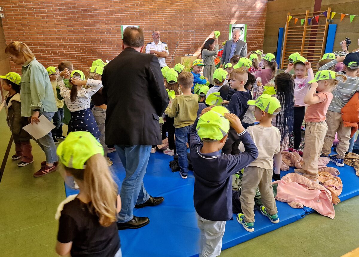 Feierlich überreichte Josef Argauer, Geschäftsführer der Ortsverkehrswacht, am Ende 44 Erstklässlern die traditionellen gelben Mützen, die vom Zweiradcenter gespendet wurden. „Tragt diese Mützen bitte jeden Tag“, bat er die Kinder, „denn so können euch die Autofahrer schon von Weitem sehen.“