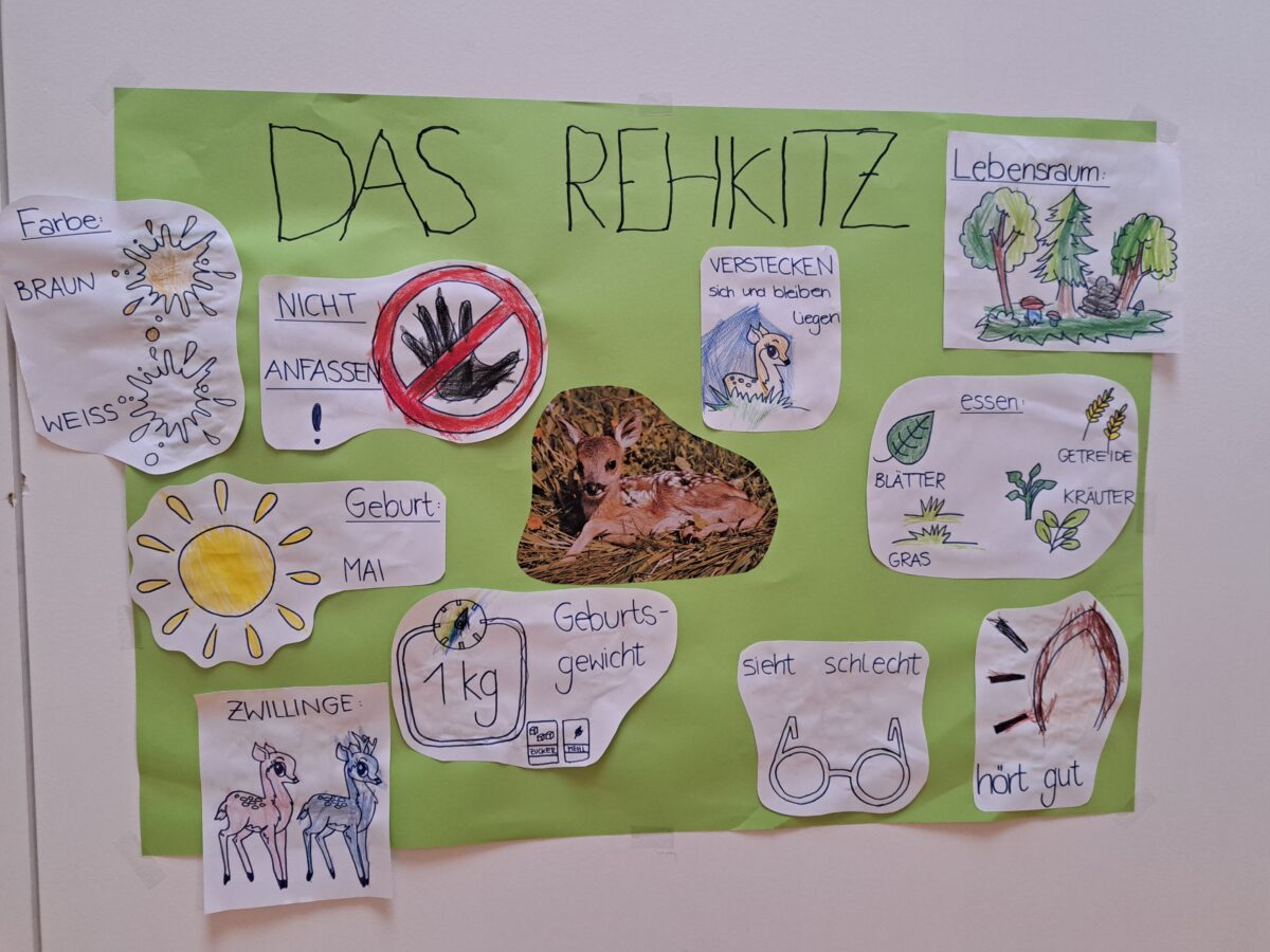 Nun ging es aber an den eigentlichen Teil der Aktion. Das Retten der Kitze. Die Kinder hatten schon ein super Plakat gebastelt, mit allerhand wissenswerten über das Kitz. Eben auch, dass es mit seinen weißen Punkten bestens im hohen Gras getarnt ist und deshalb nicht wegläuft, sondern sich bei Gefahr duckt und sich ganz ruhig verhält.