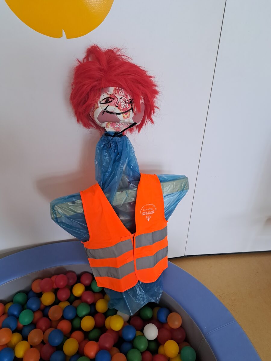 Da aber unsere Kühe zu dieser Zeit gerne frisches Gras fressen, werden die Wiesen von den Bauern gemäht und da die Kitze nicht aufspringen und davon hüpfen, laufen sie Gefahr totgemäht zu werden. Um genau dies zu verhindern, dürfen die Kids tätig werden. Sie dürfen lustige und grausige Kitzscheuchen basteln. Als Vorlage hat der Jäger Andreas schon mal eine Pumucklscheuche mitgebracht. Zum Ende durften die Kinder noch einen kleine Apportierübung von Jagdhund Kay bestaunen.