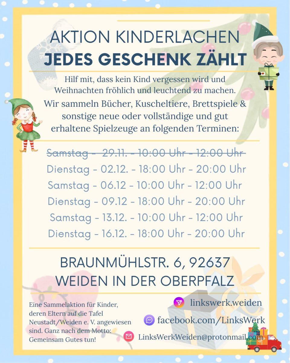 Mit jeder Spende schenken Sie einem Kind in unserer Region ein Stück Weihnachtsfreude. Viele Spielsachen warten darauf, neue Abenteuer zu erleben – helfen Sie mit, Weihnachtswünsche wahr werden zu lassen! Für Rückfragen: LinksWerkWeiden@protonmail.com