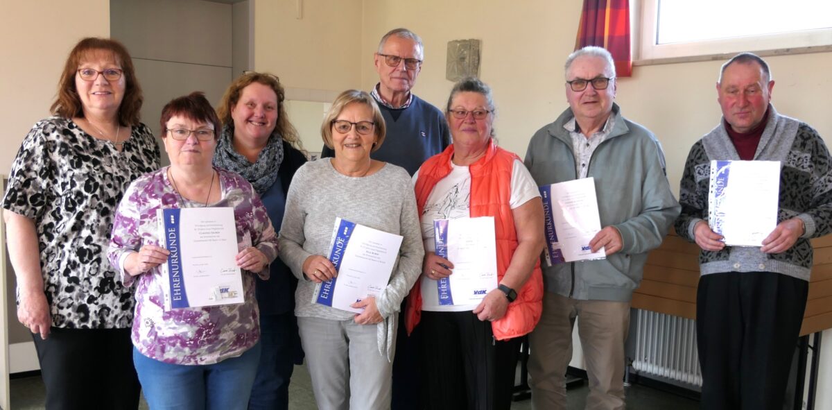 Vor den Neuwahlen wurden die langjährigen VdK-Mitglieder geehrt. Für 30 Jahre: Claudia Tauber, für 25 Jahre: Ella Buber, Werner Schreml und Thomas Grimm sowie Heidi Kessler für 15 Jahre.