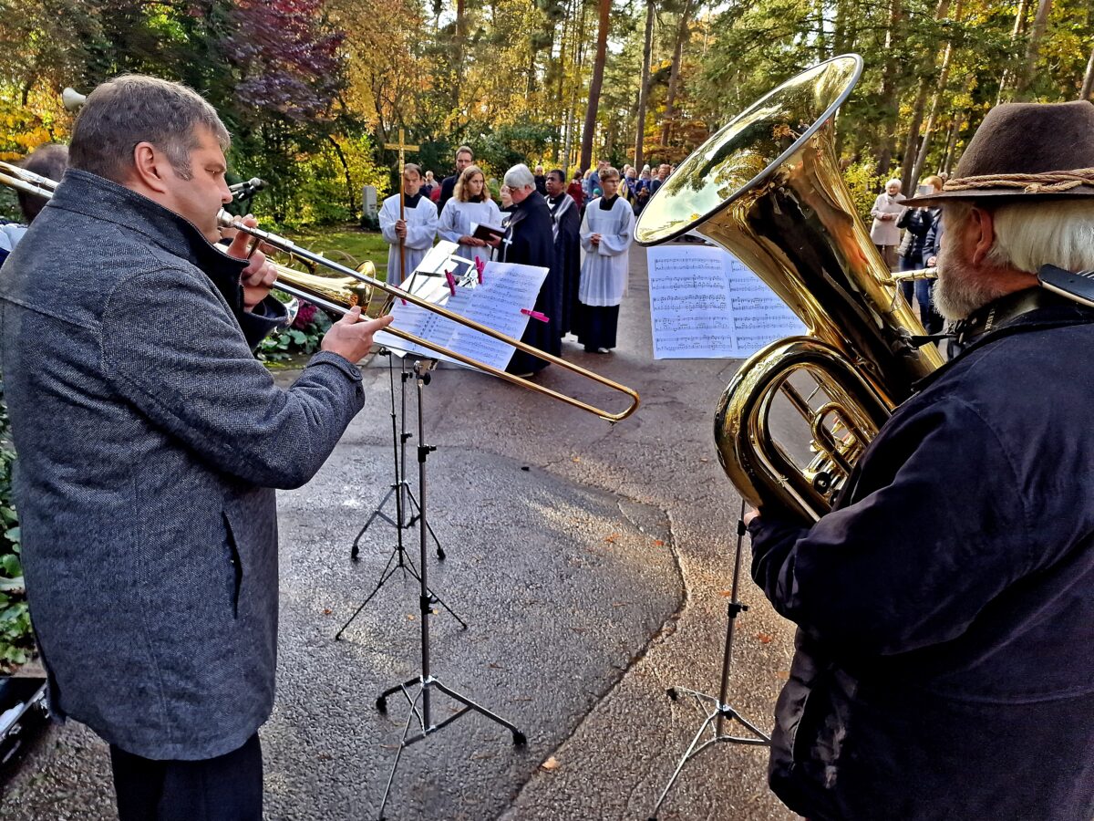 Gemeinsam zogen Ministranten, Geistlichkeit und Gläubige an das große Friedhofkreuz. Nach den verschiedenen Adagio aus der Osterzeit durch die Bläsergruppe St. Elisabeth, zogen die beiden Geistlichen durch die Reihen, sie segneten die Gräber mit Weihwasser. In der Zeit wurden die Litaneien gebetet.
