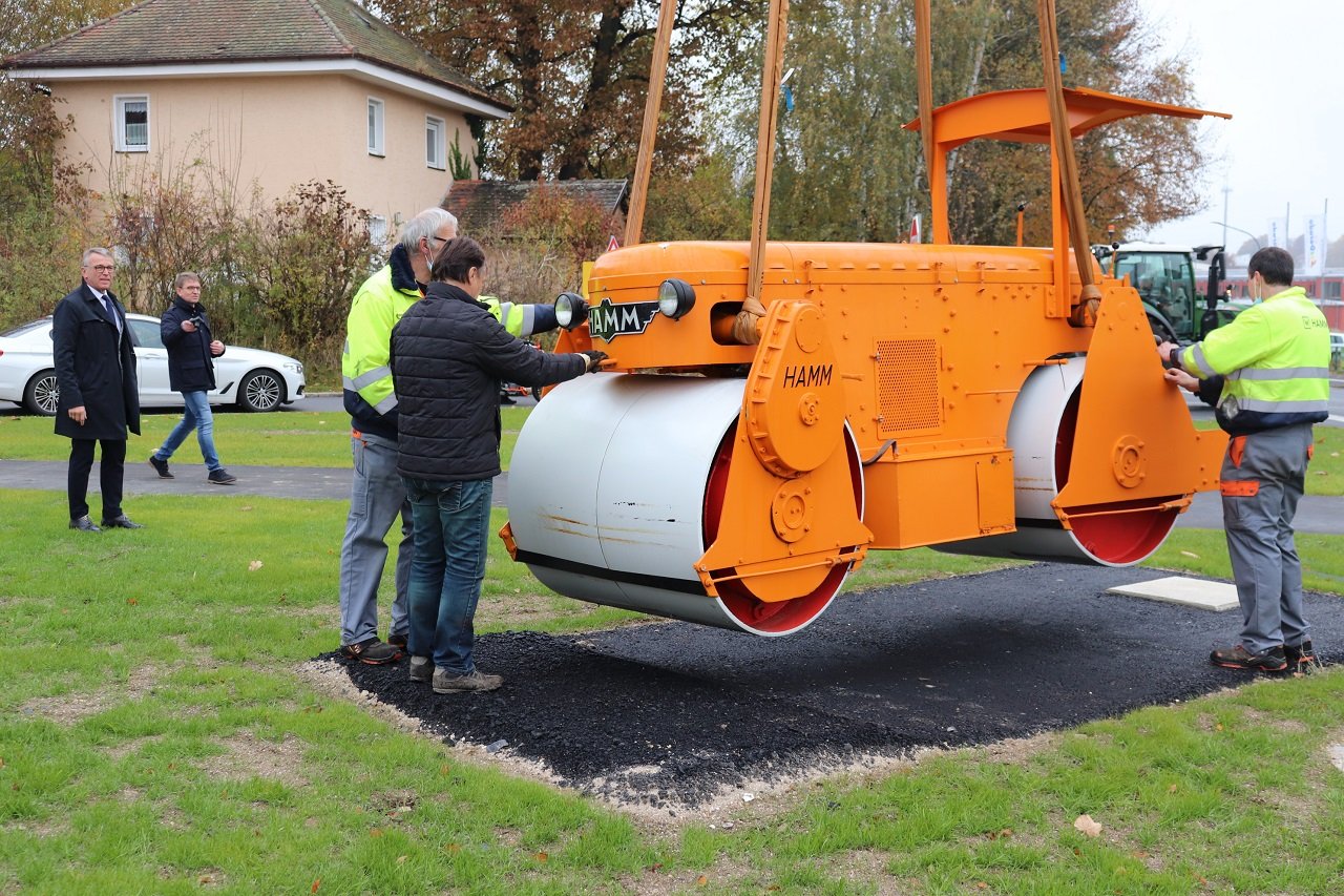 Künftig wird die rund fünf Tonnen schwere Walze vom Typ VTD dort nicht nur auf den nahegelegenen weltgrößten Straßenwalzenhersteller hinweisen, sondern sicher auch eine große Attraktion für alle Vorbeikommenden sein.