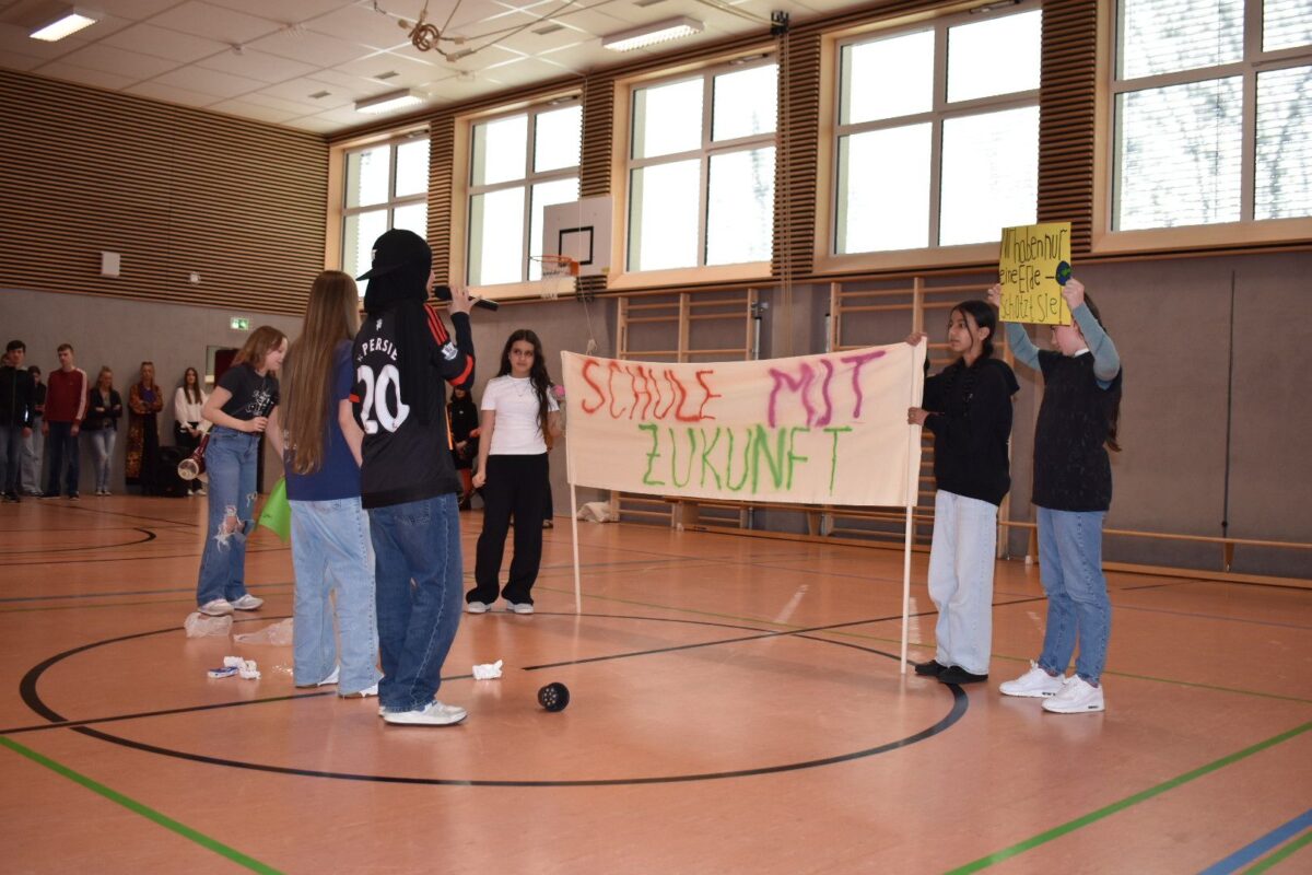 Die Veranstaltung begann in der Turnhalle mit einer Begrüßung durch die Rektorin Gabriela Reitinger-Maier. Doch dann gab es eine Überraschung. Eine Demonstration zum Thema „Schule mit Zukunft“ unterbrach die Begrüßung. Angeführt wurde sie von der 5. Klasse. Deren Engagement zeigte klar: Hier geht es um die Zukunft aller.