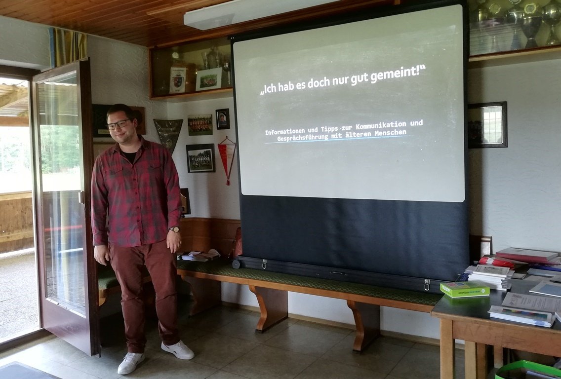 Sebastian Schuster von der Gerontopsychiatrische Koordinationsstelle Oberpfalz im Sozialpsychiatrisches Zentrum Amberg vermittelte Informationen und Tipps zur Kommunikation und Gesprächsführung mit älteren Menschen. „Verstehen und verstanden werden – nicht immer leicht“, wie Sebastian Schuster weiß, denn: „das Gegenteil von gut ist gut gemeint“. Auch bei diesem wichtigen Thema spielen die Bedürfnisse, Fähigkeiten und Fertigkeiten älterer Menschen eine große Rolle.