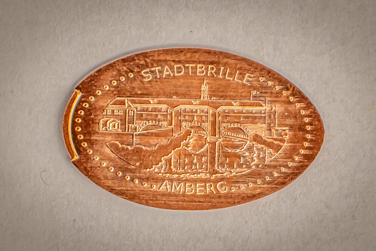 Direkt an einer der Hauptsehenswürdigkeiten der Stadt Amberg, an der so genannten „Stadtbrille“, steht seit einigen Wochen ein neuer Medaillenpräger. Dieser verwandelt beim Einwurf von zwei Euro eine 5-Cent-Münze auf mechanischem Weg in eine hochwertige Souvenirmedaille. In Amberg stehen an diesem neuen Münzprägeautomaten gleich drei Motive zur Auswahl: eben jene Stadtbrille, das historische Amberger Rathaus sowie das prächtige Nabburger Tor.