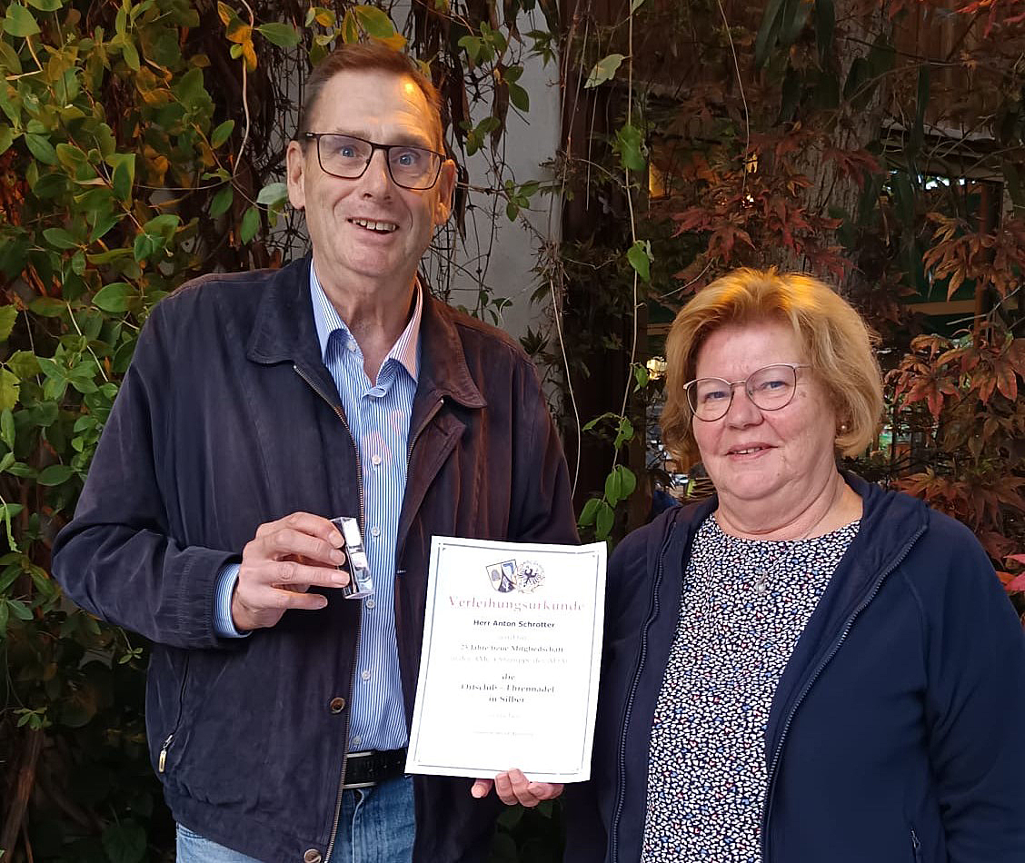 Für 25 Jahre Mitgliedschaft im Ortsclub, hatte Renate Müller bei einem Besuch in der Patengemeinde Algund die Gelegenheit wahrgenommen, um an Toni Schrötter die Auszeichnung zu übergeben. Der ehemalige Bürgermeister der Patengemeinde ist dem ADAC immer noch treu und war vor allem in langjähriger und inniger Freundschaft mit dem ehemaligen und bereits verstorbenen Ortsclubvorsitzenden Gerhard Haubner und dessen Ehefrau Edda verbunden.