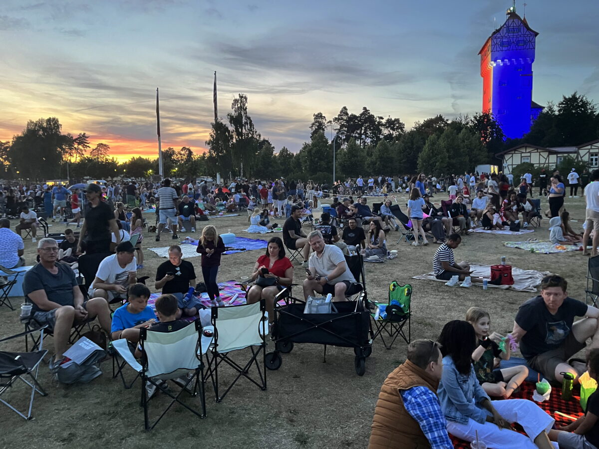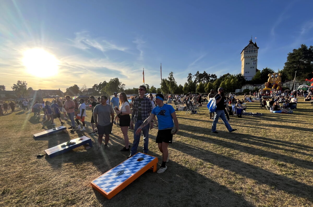 Nach dem respektvollen Verharren mit dem Blick zum Sternenbanner bei der US-Hymne heizte ein DJ richtig ein. Rund 3000 Gäste hatten sich auf den Bierbänken und auf der Wiese des Paradefeldes vor dem Wasserturm niedergelassen. Ausgestattet mit Picknickkörben und Coolern und allerlei Camping Equipment feierten die amerikanischen Soldaten mit ihren Familien und Deutschen Gästen. Nach der Tradition” gab´s Drinks und Food, lange Schlangen reihten sich vor den Ständen mit den amerikanischen Spezialitäten. Vergnügt wurde sich mit Cornhole und Ballspielen. Hüpfburgen, Bullriding, Rutschen und weitere Stände sorgten für die Kurzweil der jüngsten Festbesucher.