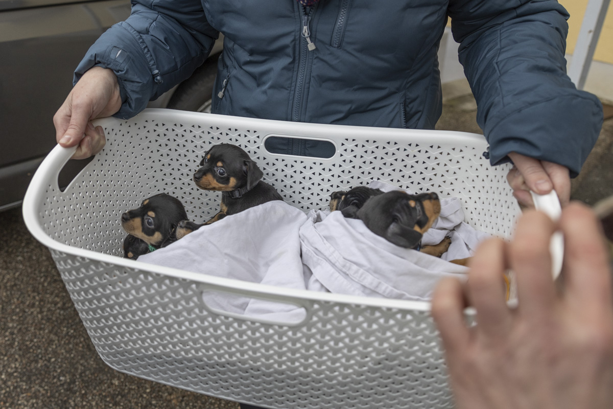 Hündin Hatice wird mit Maulkorb und Leine in den Polizeibus geführt. Die Welpen werden im Wäschekorb durchs Treppenhaus getragen. Im Tierheim wartet schon Chefin Jutta Böhm. Drei, möglicherweise auch fünf Wochen werden die Welpen mit ihrer Mutter im Tierheim bleiben müssen. Jutta Böhm bittet Interessenten vorerst nicht nachzufragen. Die Pinscher müssen noch sozialisiert werden und beim Verkauf mindestens acht Wochen alt sein.