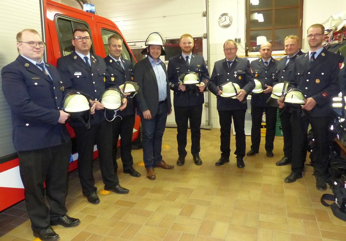 Bürgermeister Anton Kappl hat offiziell die neuen Schutzhelme im Döllnitzer Feuerwehrhaus den Kommandanten der fünf Wehren übergeben. Für die Wehren aus Leuchtenberg nahm Kommandant Manuel Tschirschke, für Michldorf Martin Reil, für Lerau Helmut Kellner, für Wittschau/Preppach Hermann Federl und für Döllnitz Matthias Maier die neuen Helme entgegen. Das Gemeindeoberhaupt dankte dem Döllnitzer Kommandanten Matthias Maier, der sich um die Bestellung, Lieferung und die Ausgabe kümmerte.
